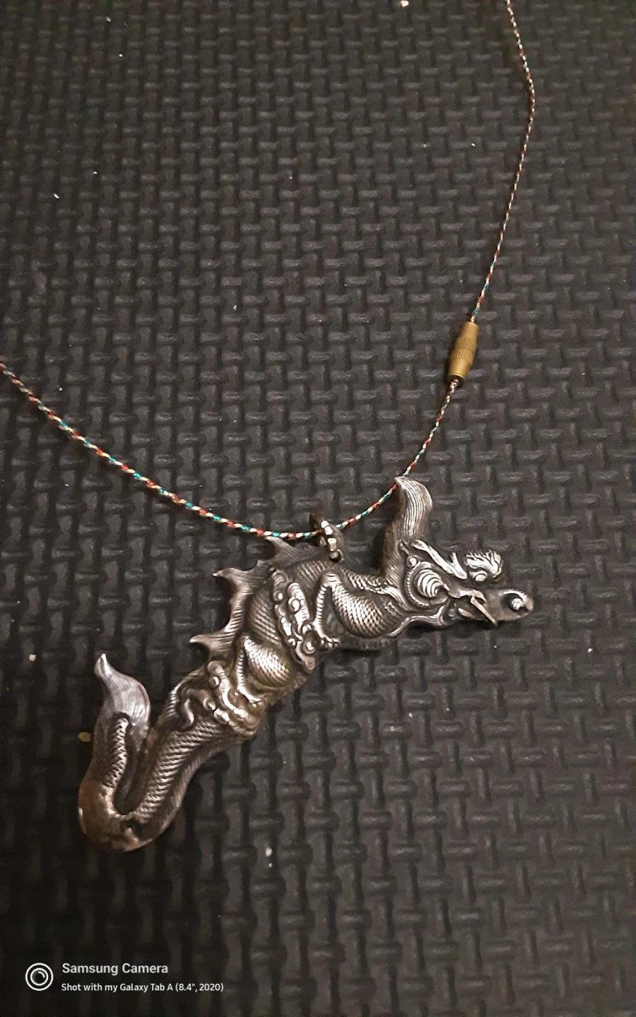 A detailed silver-dragon pendant on a multi-coloured cord. The dragon design is intricate and appears to be made of metal. It's a unique piece that adds a touch of mythical style to any outfit! This necklace could be a striking accessory for those who appreciate fantasy or symbolic jewelry.