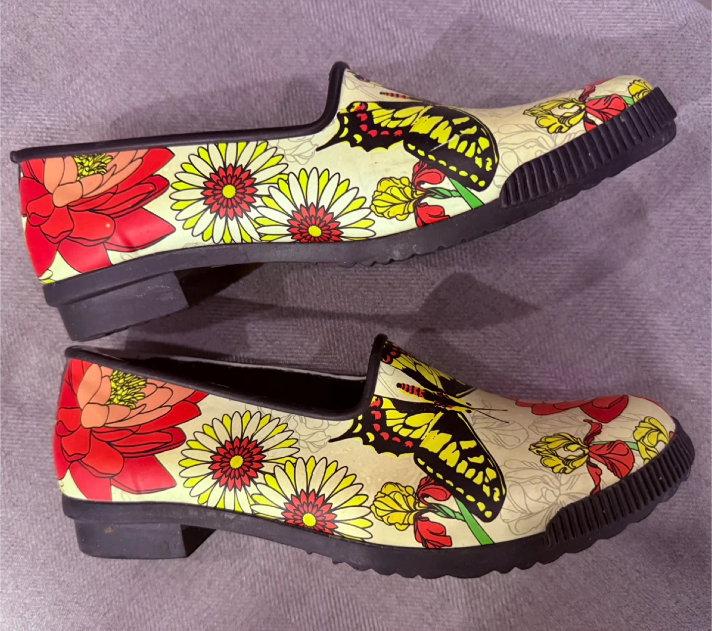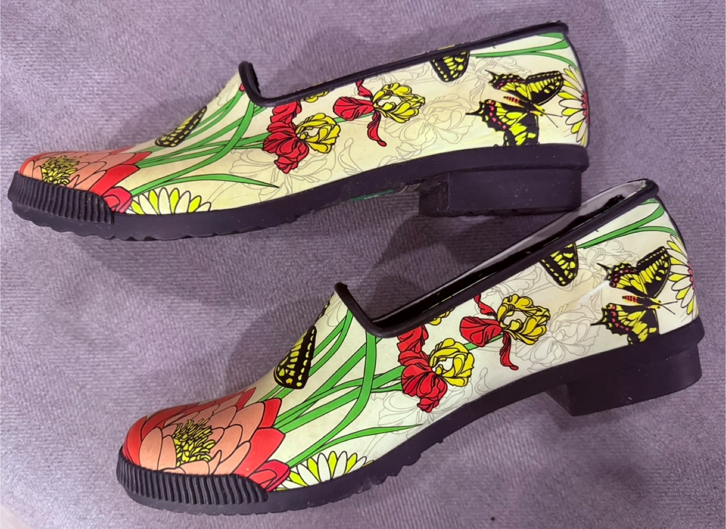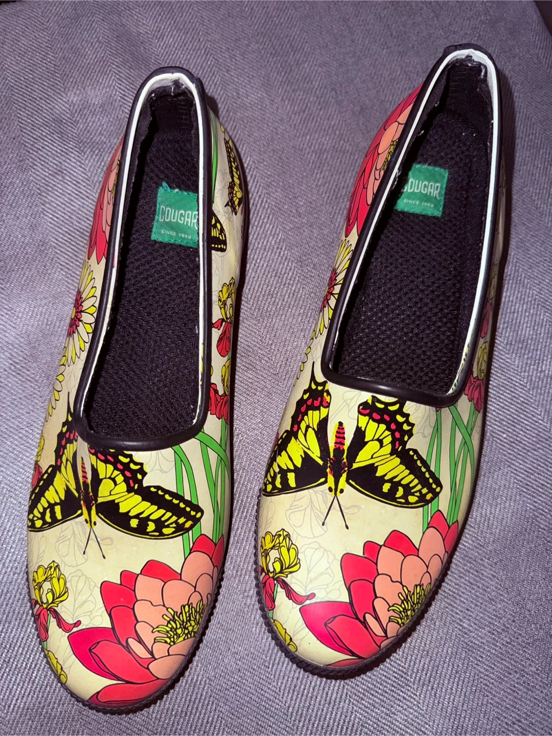 These Cougar rubber rain shoes feature a vibrant butterfly and floral print. They have a comfortable slip-on design with a low heel. Perfect for keeping your feet dry and stylish on rainy days!