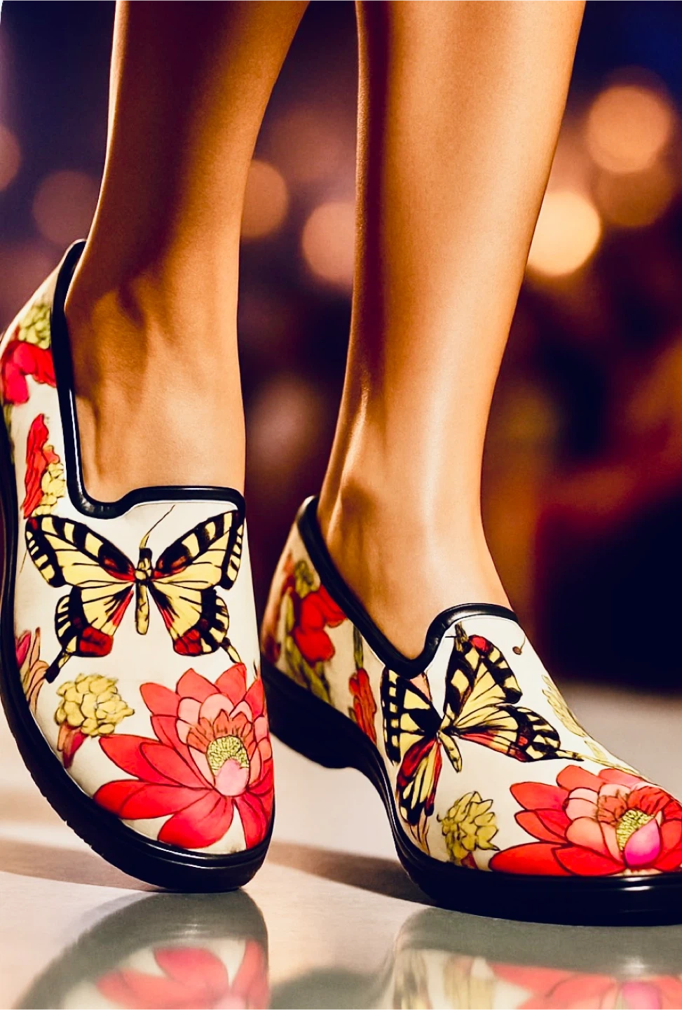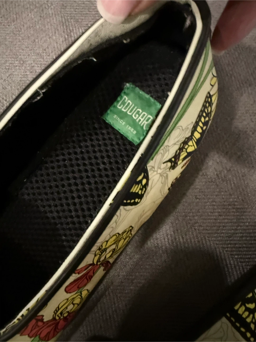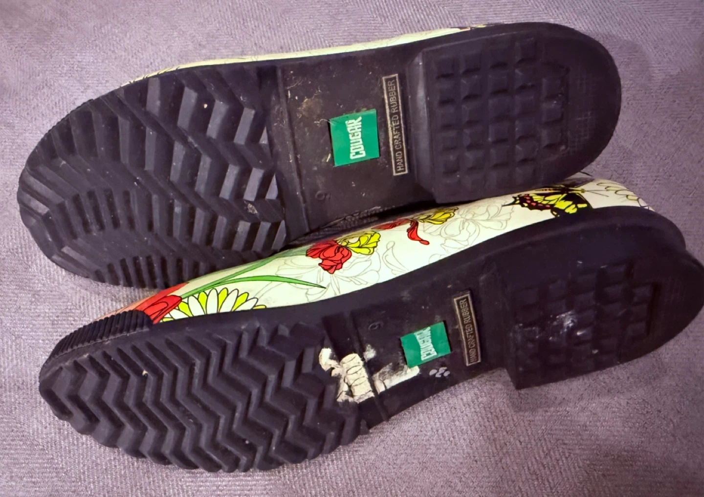 These Cougar rubber rain shoes feature a vibrant butterfly and floral print. They have a comfortable slip-on design with a low heel. Perfect for keeping your feet dry and stylish on rainy days!