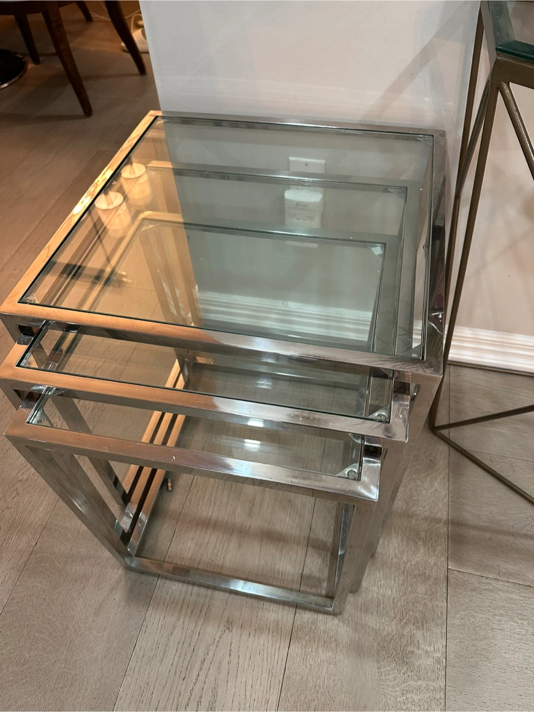 Set of three nesting side tables. Features chrome metal frames and clear glass tops. They stack neatly for space-saving storage. Useful for small spaces or providing extra surface area when needed!