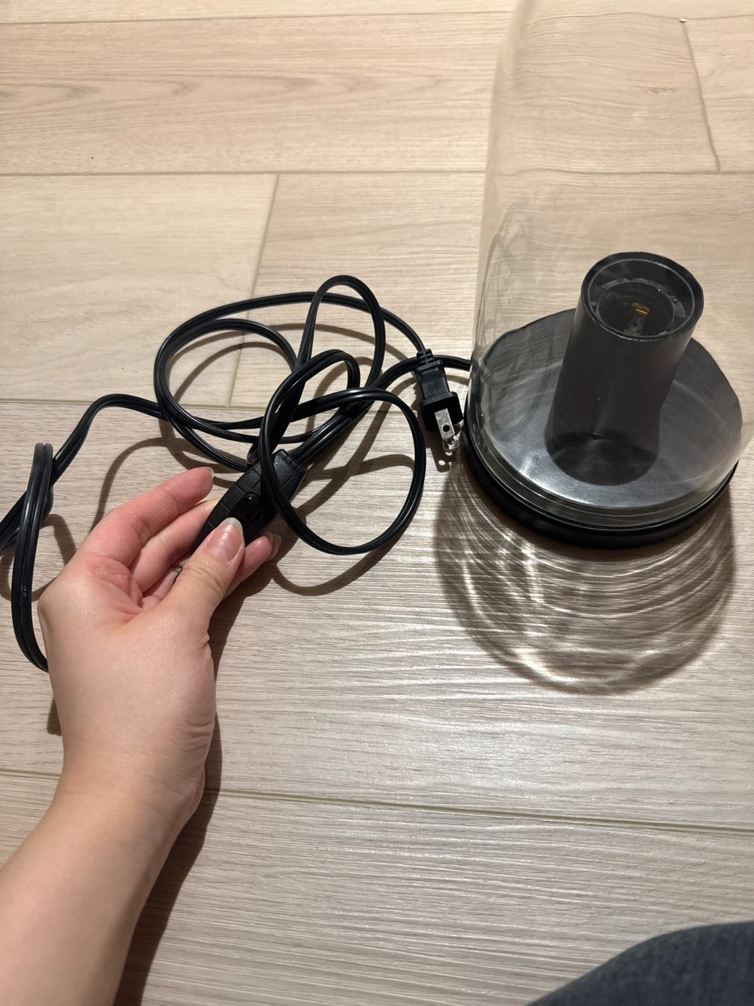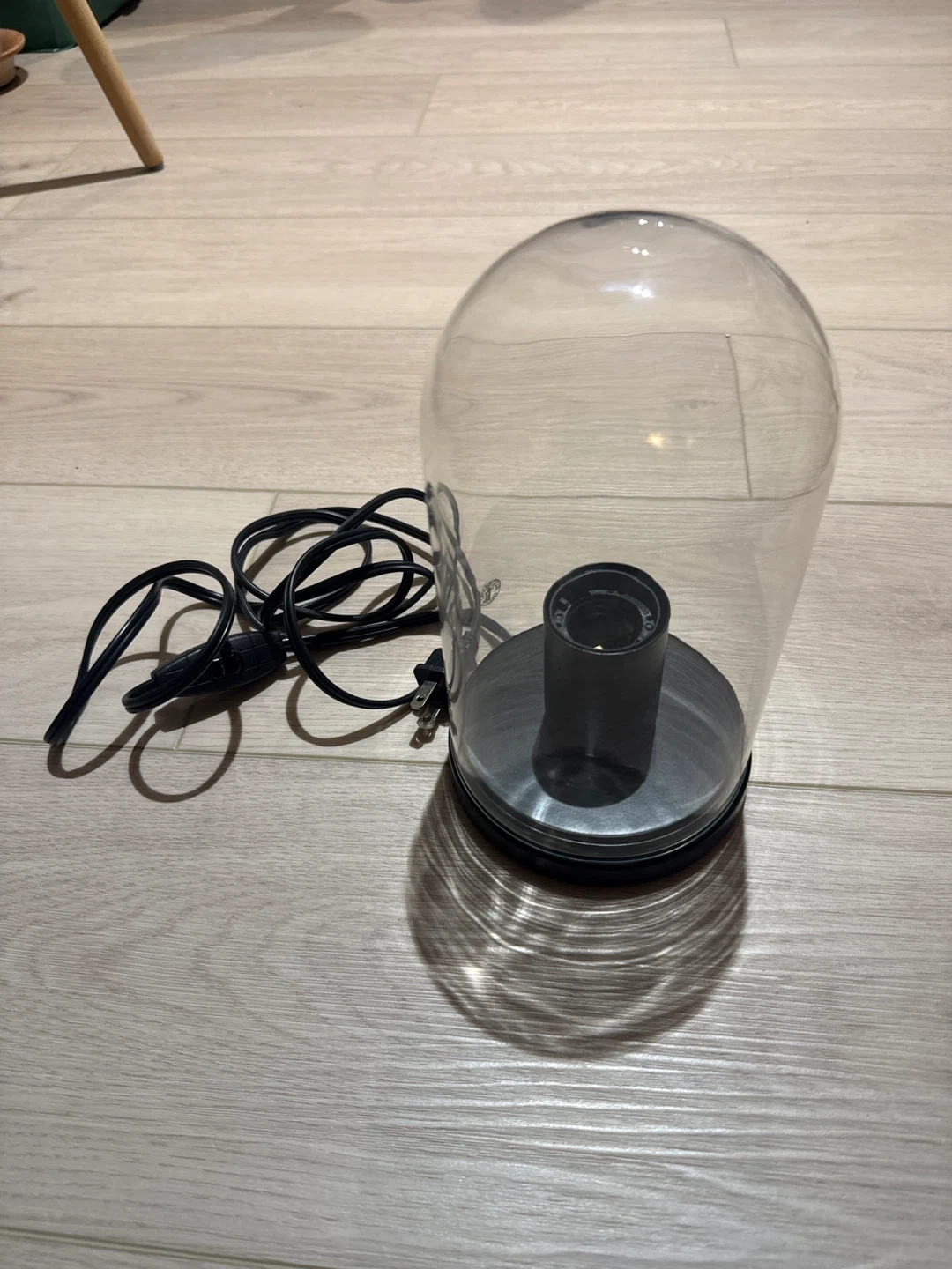 This is a glass dome table lamp with a black cord and in-line switch. It has a clear plastic dome and a dark grey base with a light socket. Power cord included. Just need to add on a nice light bulb for a soft warm glow