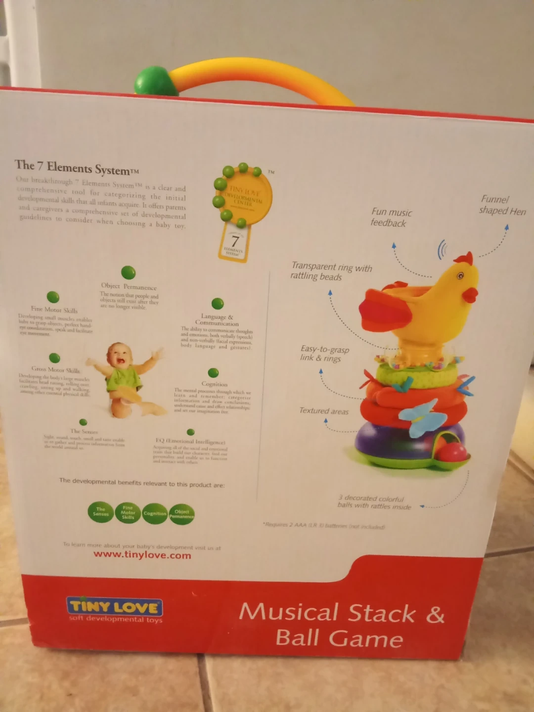 This Tiny Love Musical Stack & Ball Game is designed for babies 6 months and up. It features a fun hen shape, transparent ring with rattling beads, and textured areas. It helps develop fine motor skills, object permanence, cognition, and EQ.