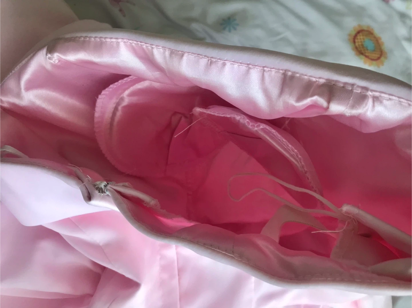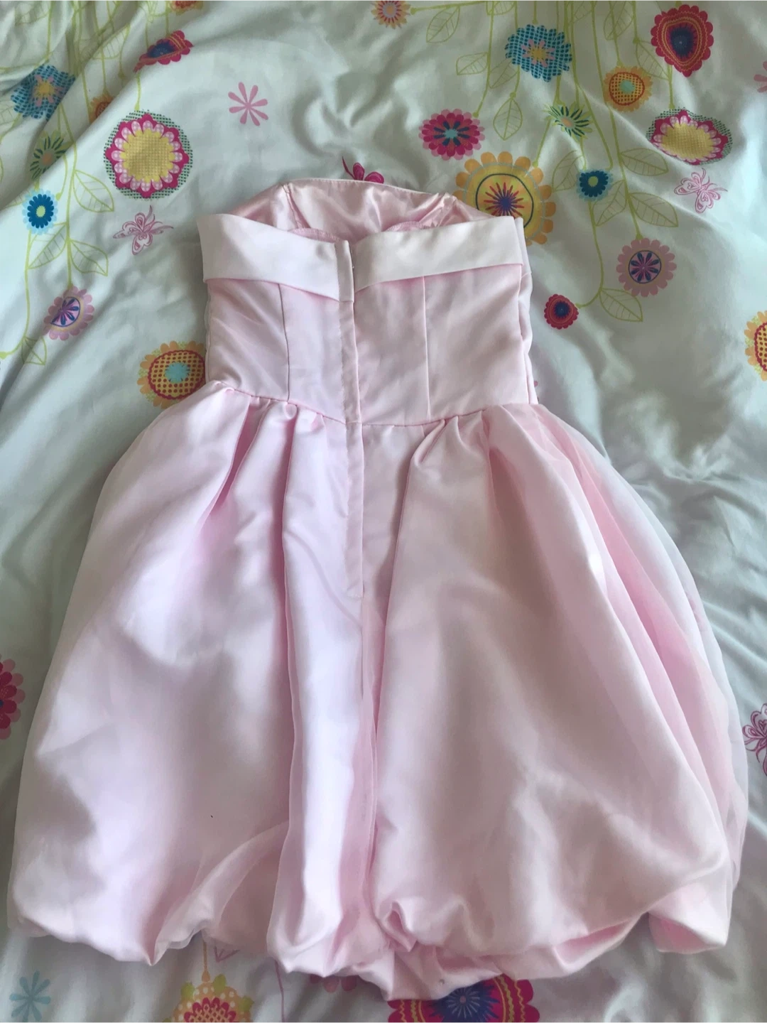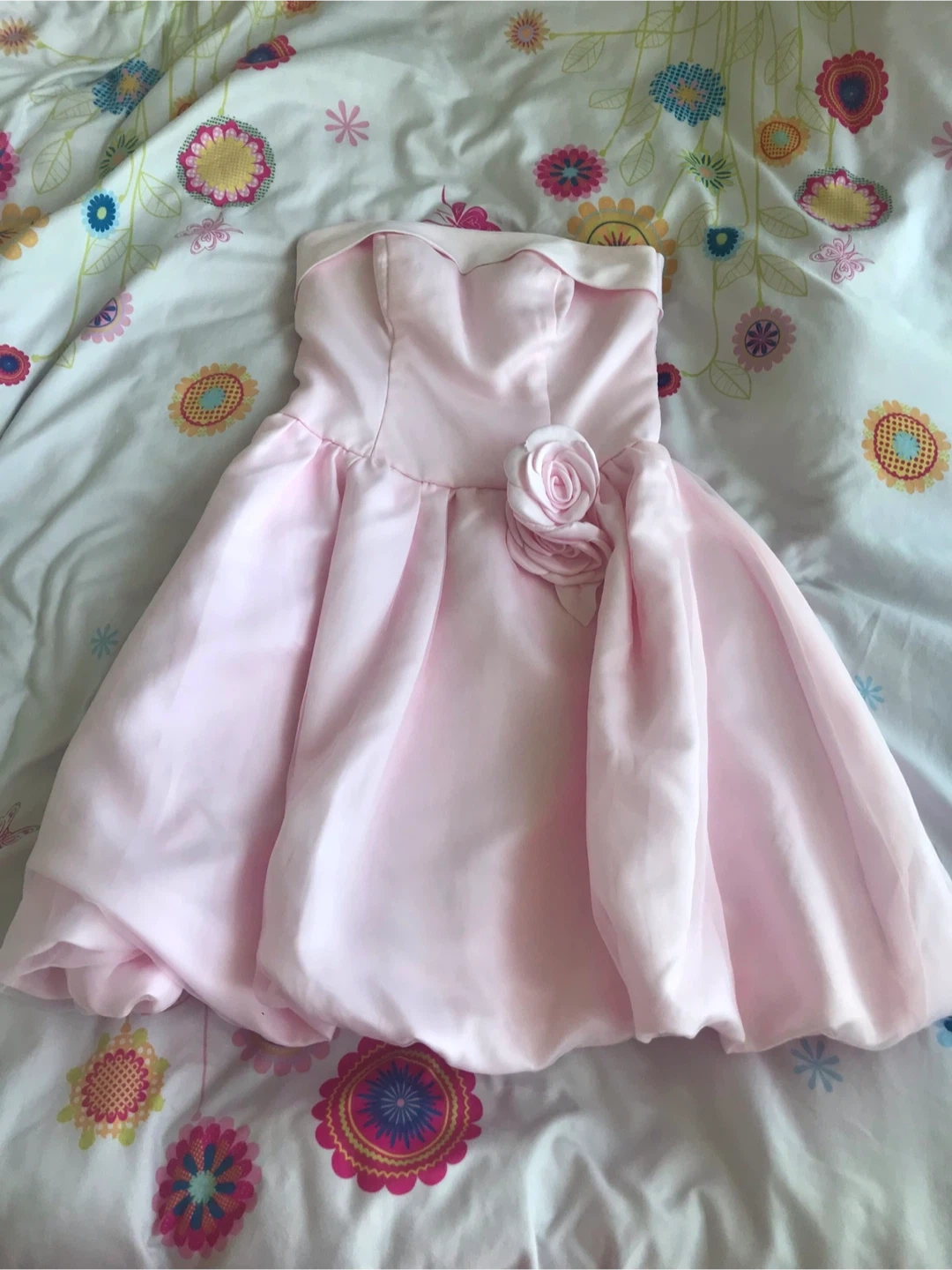 This pink strapless dress features a lovely rose detail on the side. It's made of a satin-like material with a bubble hem skirt. The bodice has some boning for structure.