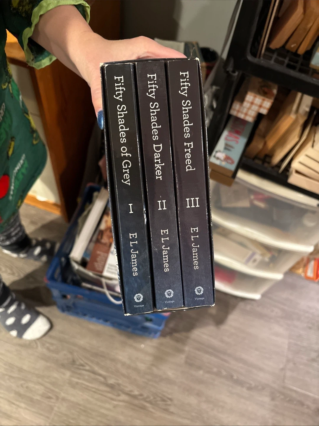 This is the Fifty Shades of Grey trilogy by E.L. James. It includes 'Fifty Shades of Grey', 'Fifty Shades Darker', and 'Fifty Shades Freed'. Books are in a slipcase.