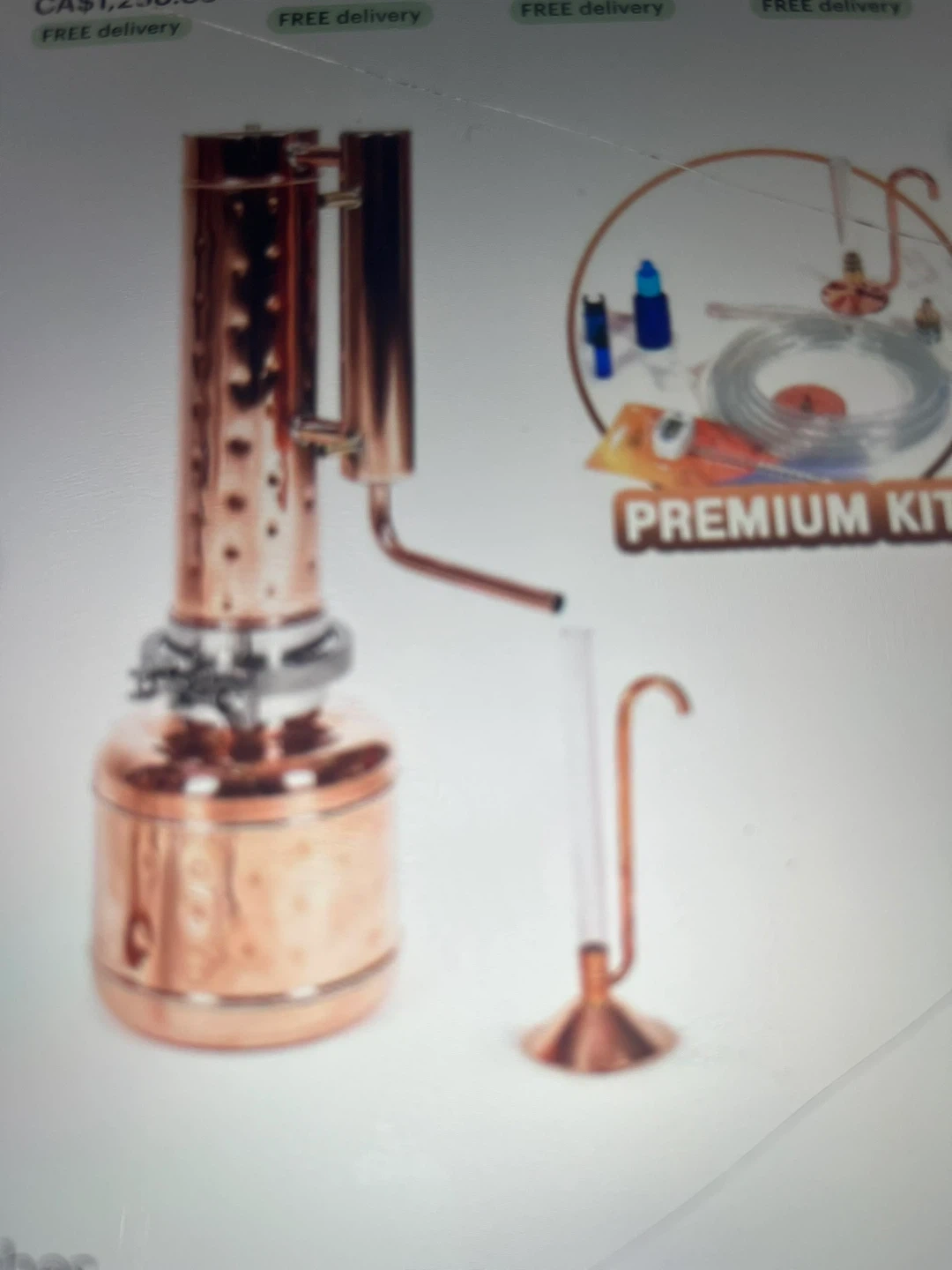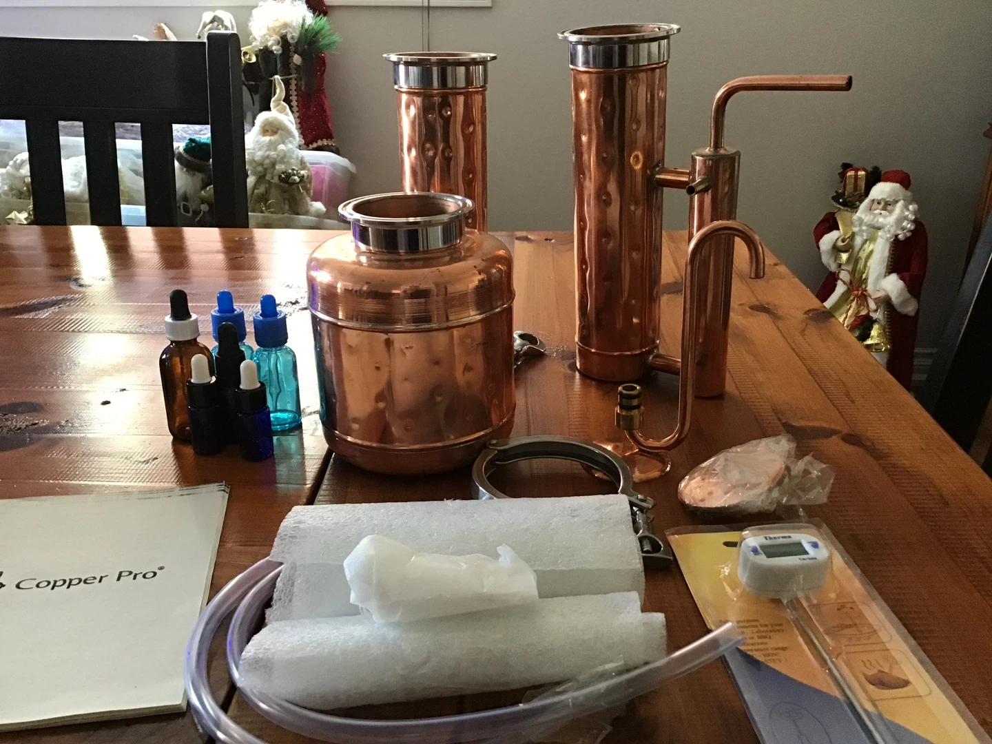 This is a Copper Pro essential oil distiller kit with a 2L capacity. It's made of copper and includes various accessories for steam distillation. This kit is useful for extracting essential oils at home.