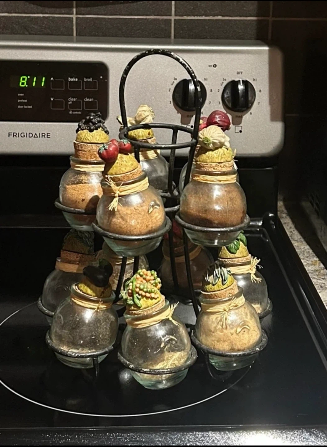 Spice rack with 10 glass jars. The jars have decorative fruit and vegetable toppers. Perfect for adding a touch of charm to your kitchen!