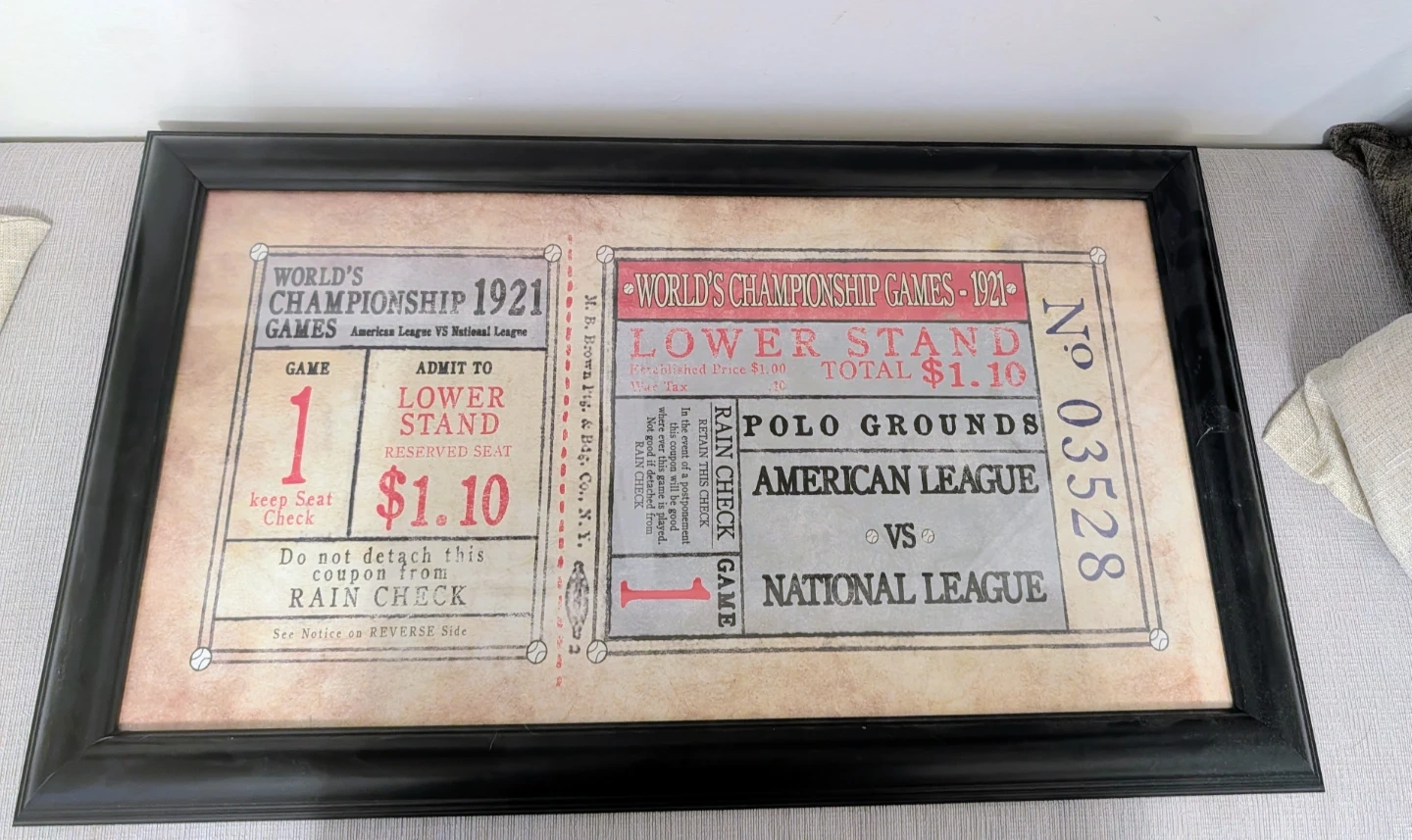 Framed 1921 World's Championship Baseball Game Ticket Decor