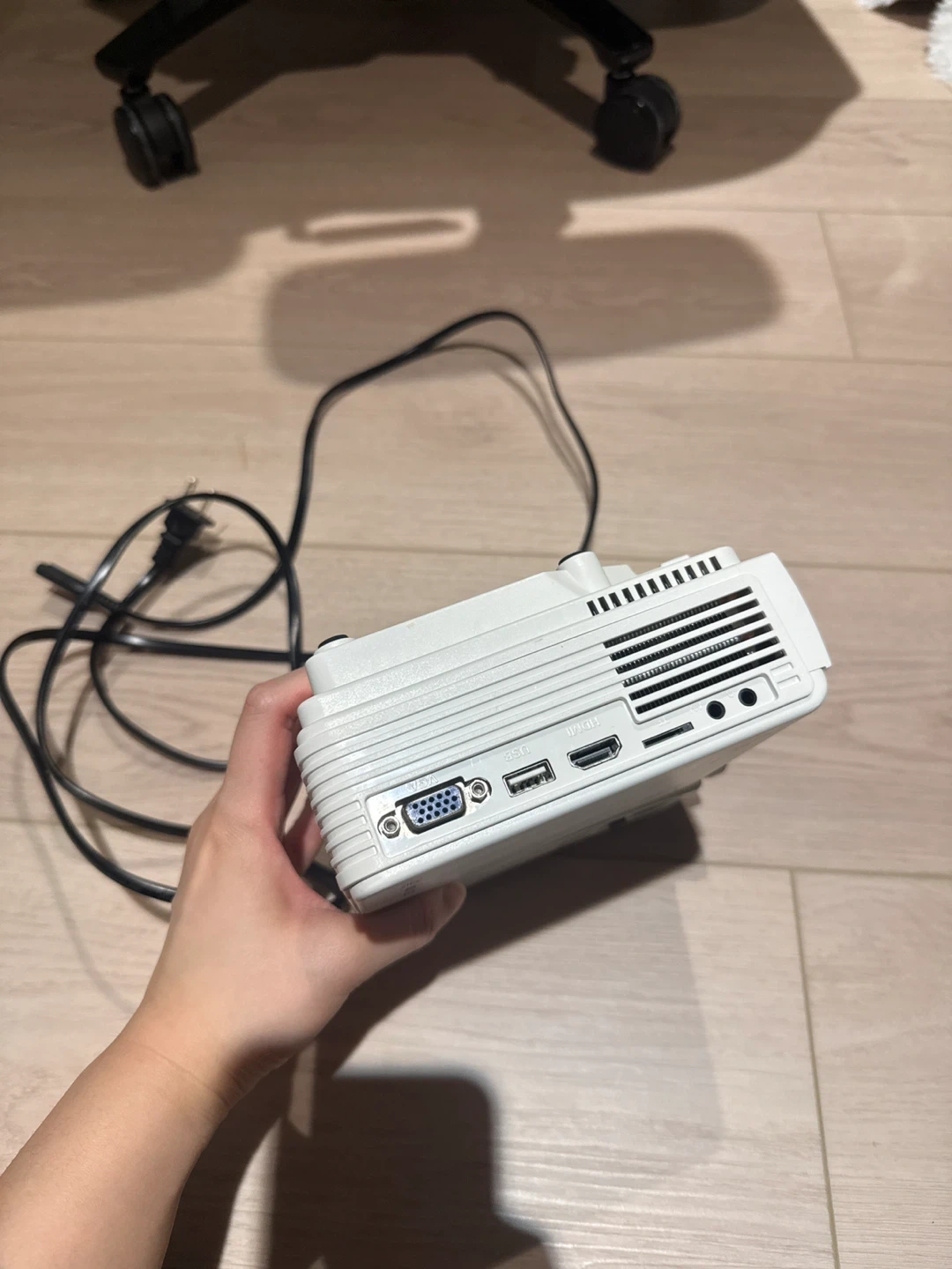 This is an ORJ Professional white projector. It has HDMI, USB, and VGA input ports. This projector is great for presentations or home theatre use!