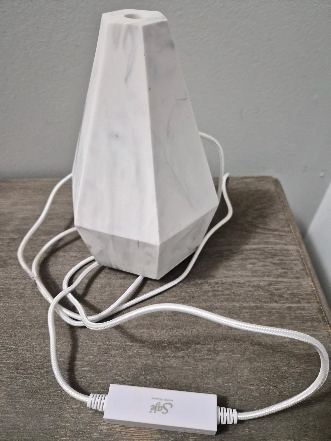 This Saje Natural Wellness diffuser has a unique geometric design with a marble-like finish. It's powered by a USB cord.
