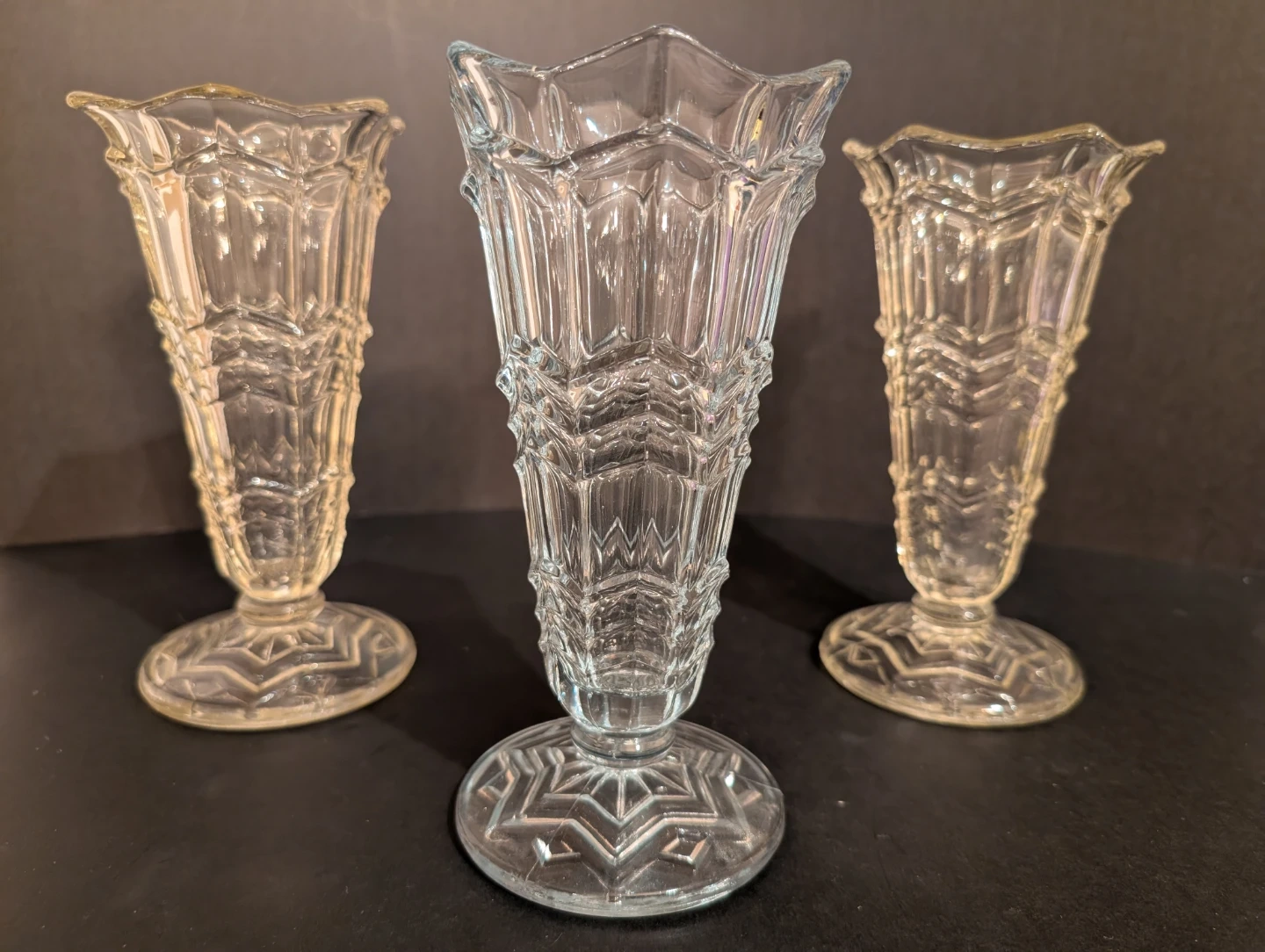 Set of 3 Art Deco 1930s Pressed Glass Vases