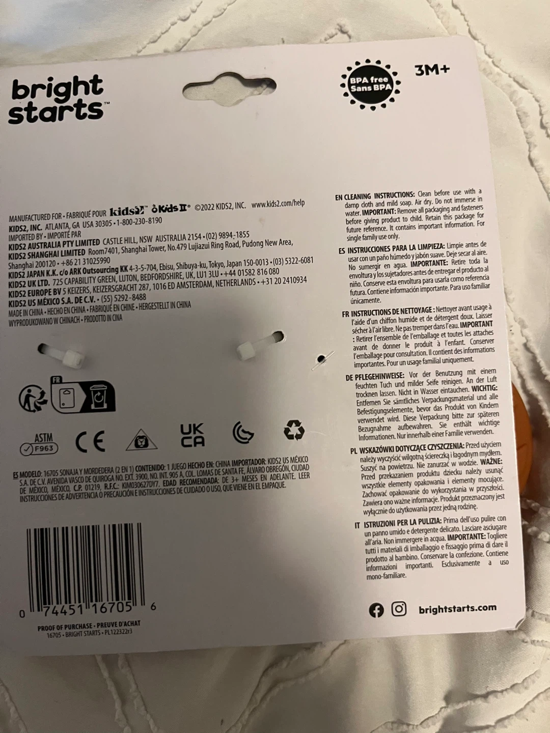 Brand new, bought for friend and never gave to her. This Bright Starts toy is designed for babies 3 months and older. It's a 2-in-1 rattle wand teether. BPA-free construction.