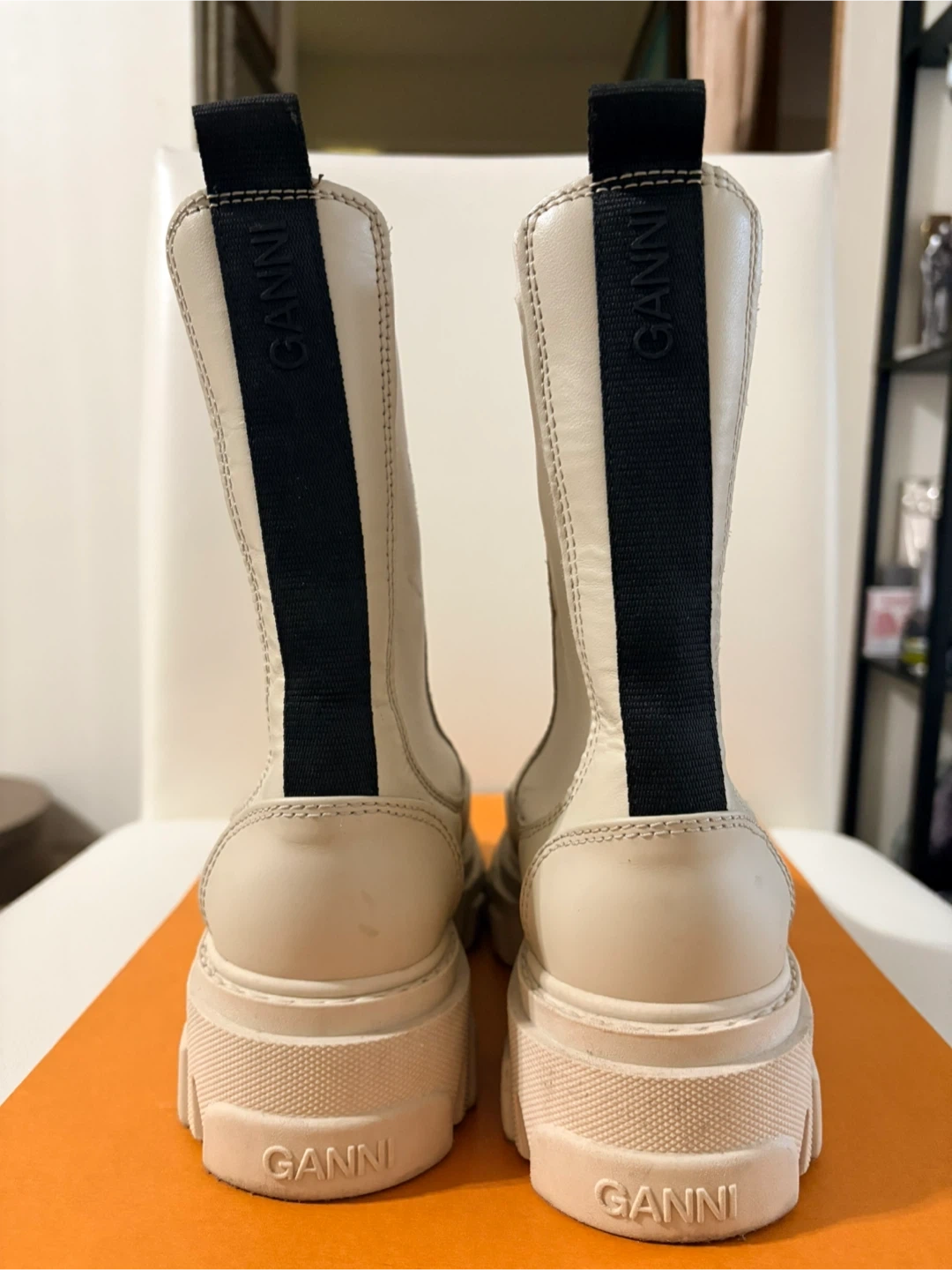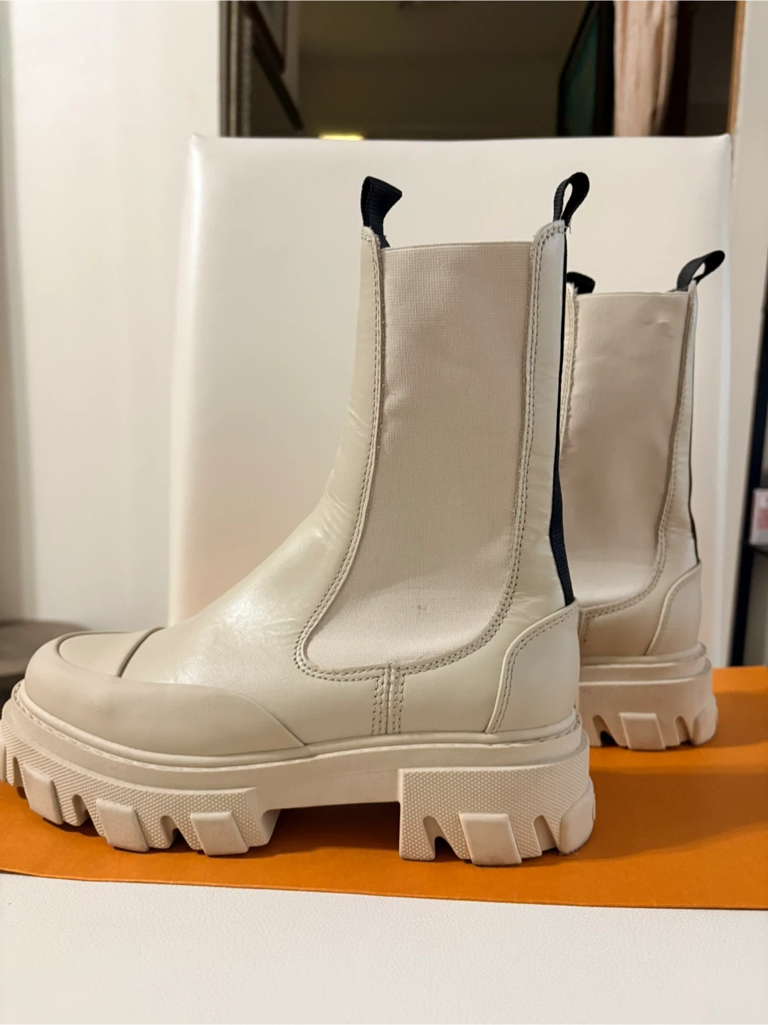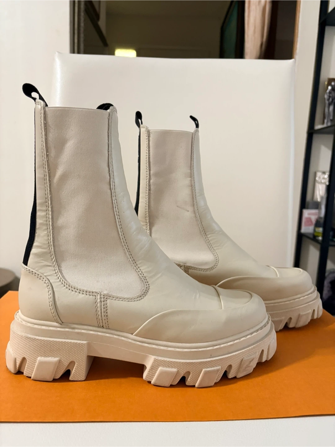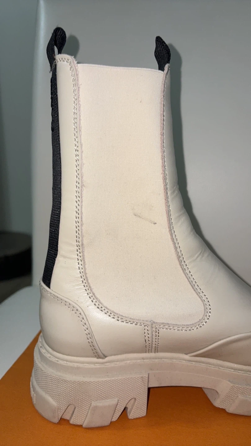 Cream leather Ganni Chelsea boots with black elastic side panels and pull tabs. These boots have a chunky lug sole for added grip. They're perfect for cool weather and add a stylish edge to any outfit!
