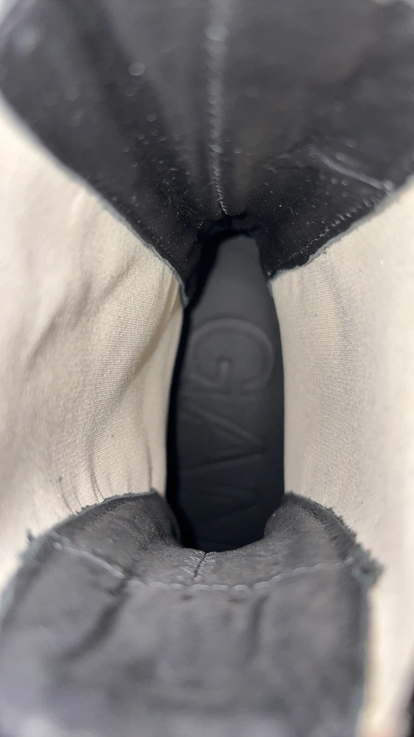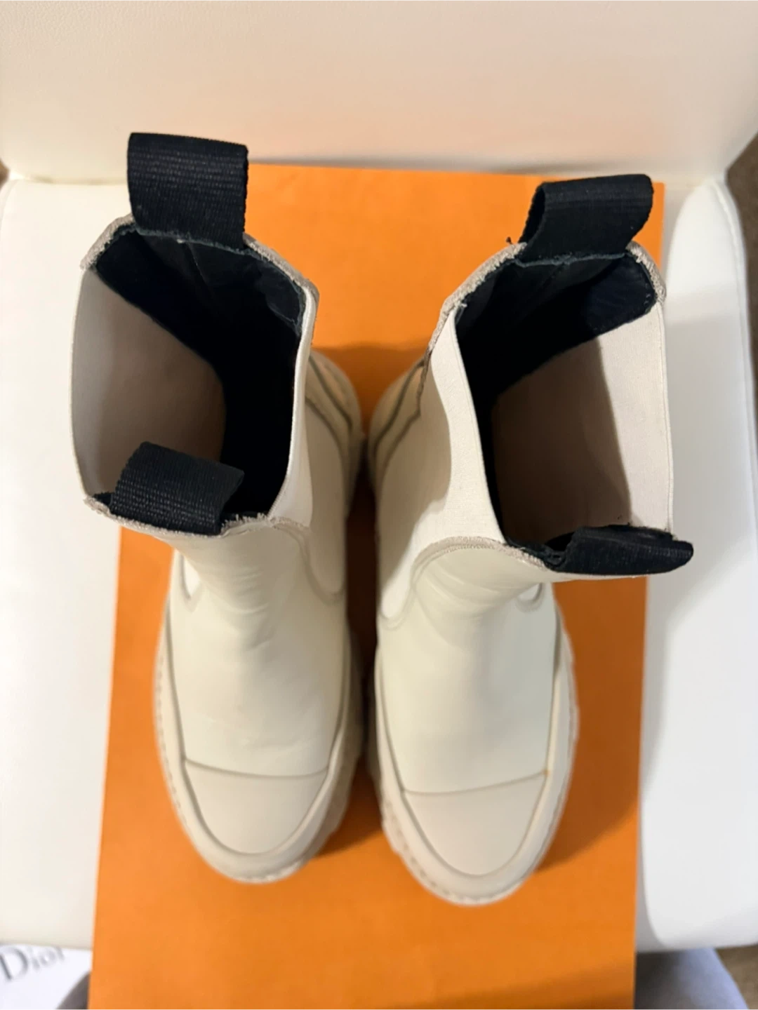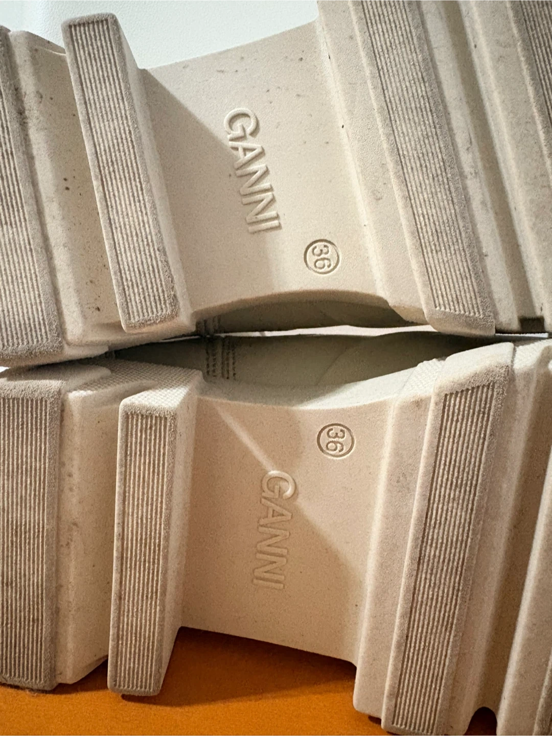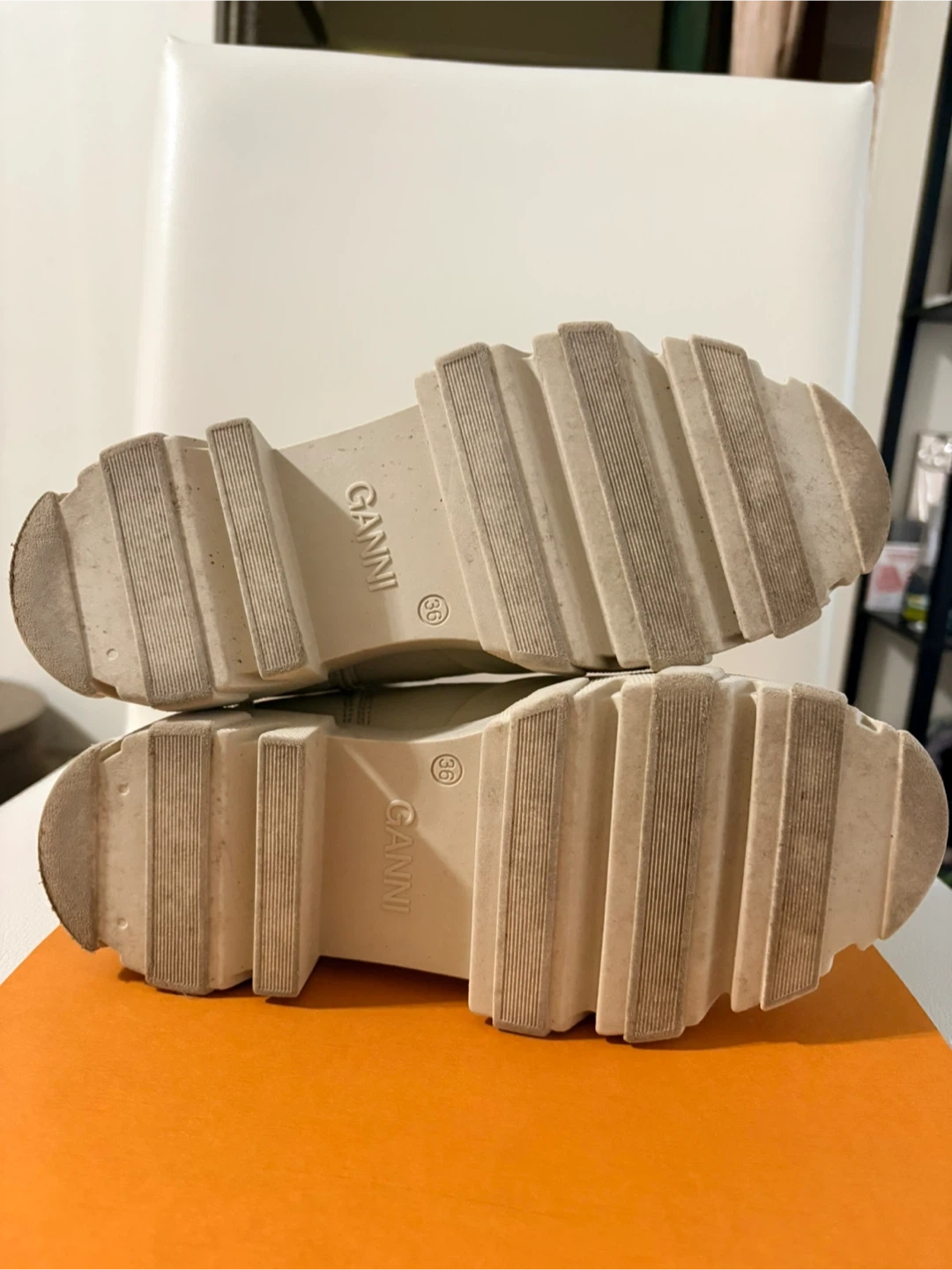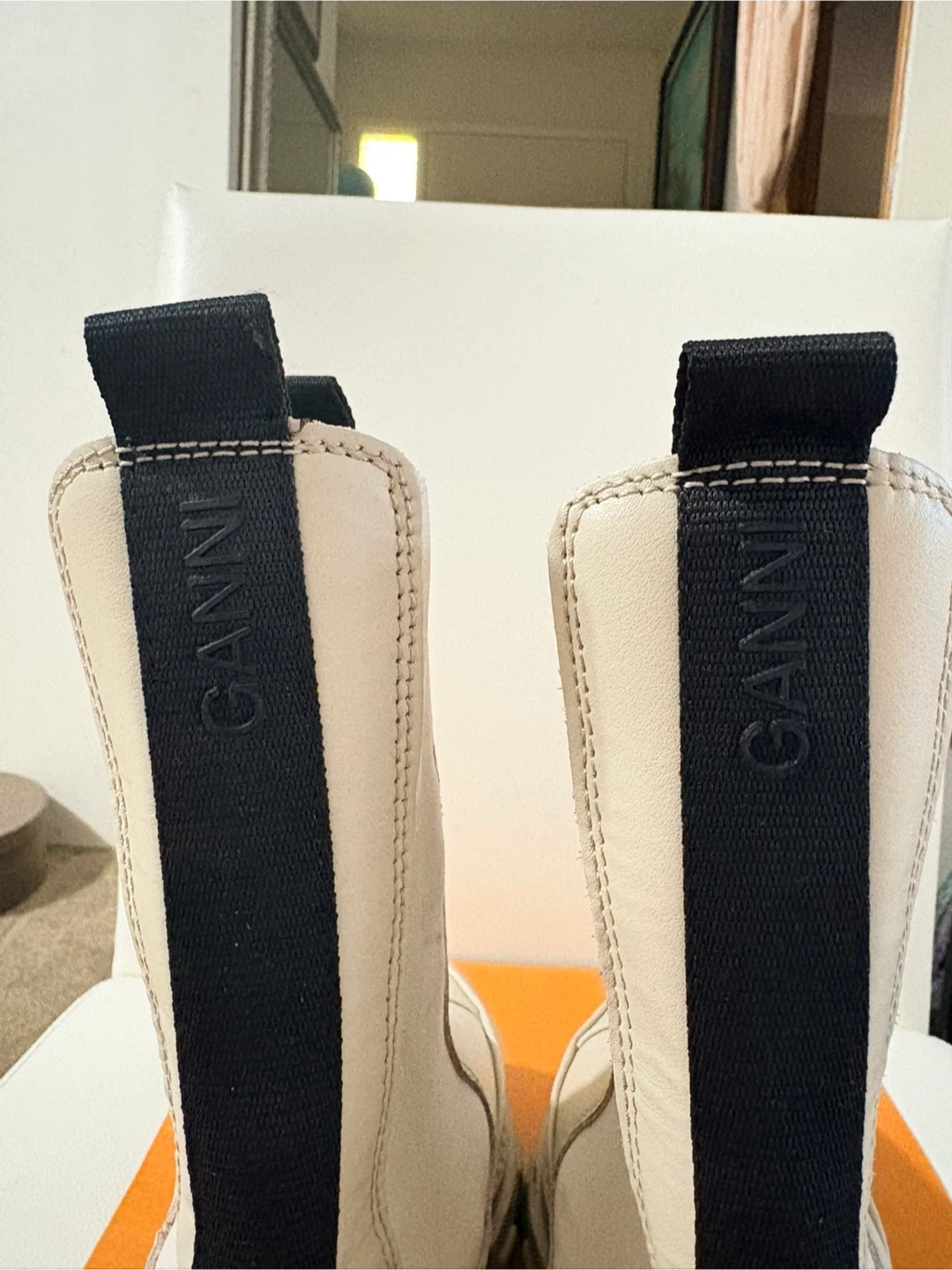 Cream leather Ganni Chelsea boots with black elastic side panels and pull tabs. These boots have a chunky lug sole for added grip. They're perfect for cool weather and add a stylish edge to any outfit!