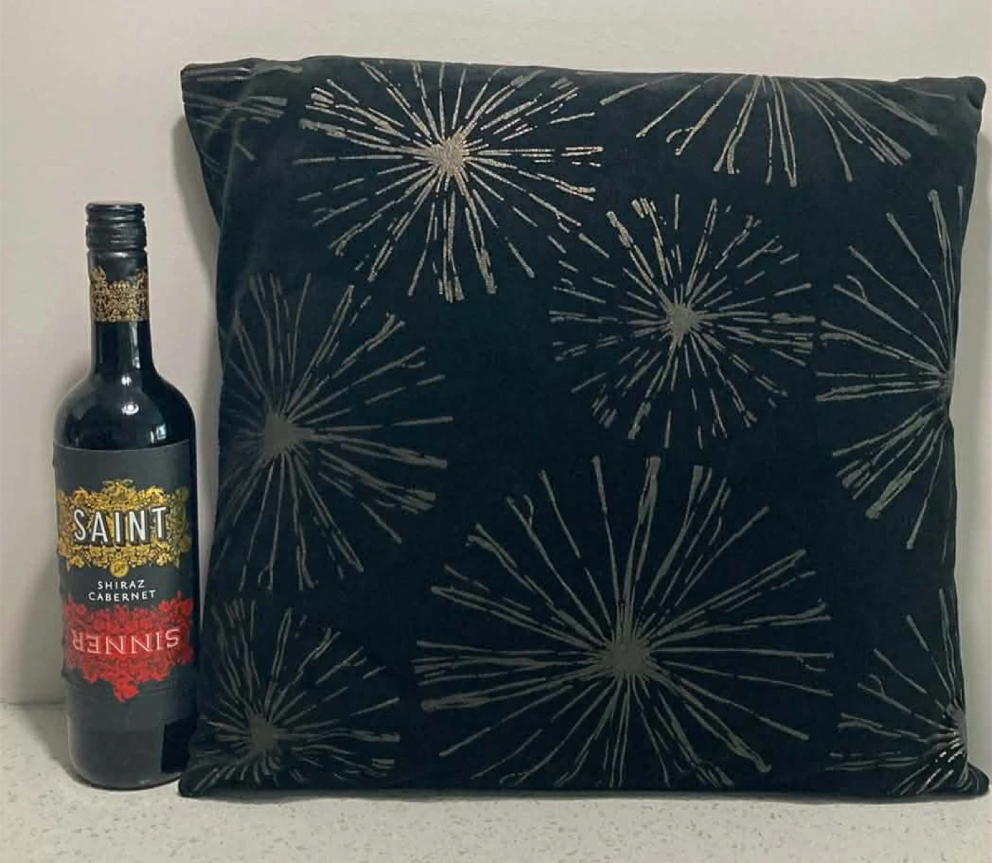This pillow features a black base with a striking silver dandelion-like pattern. It's a lovely accent for any sofa or armchair, adding a touch of modern flair. The fabric appears to be a soft velvet or velour material. Wine for sizing only