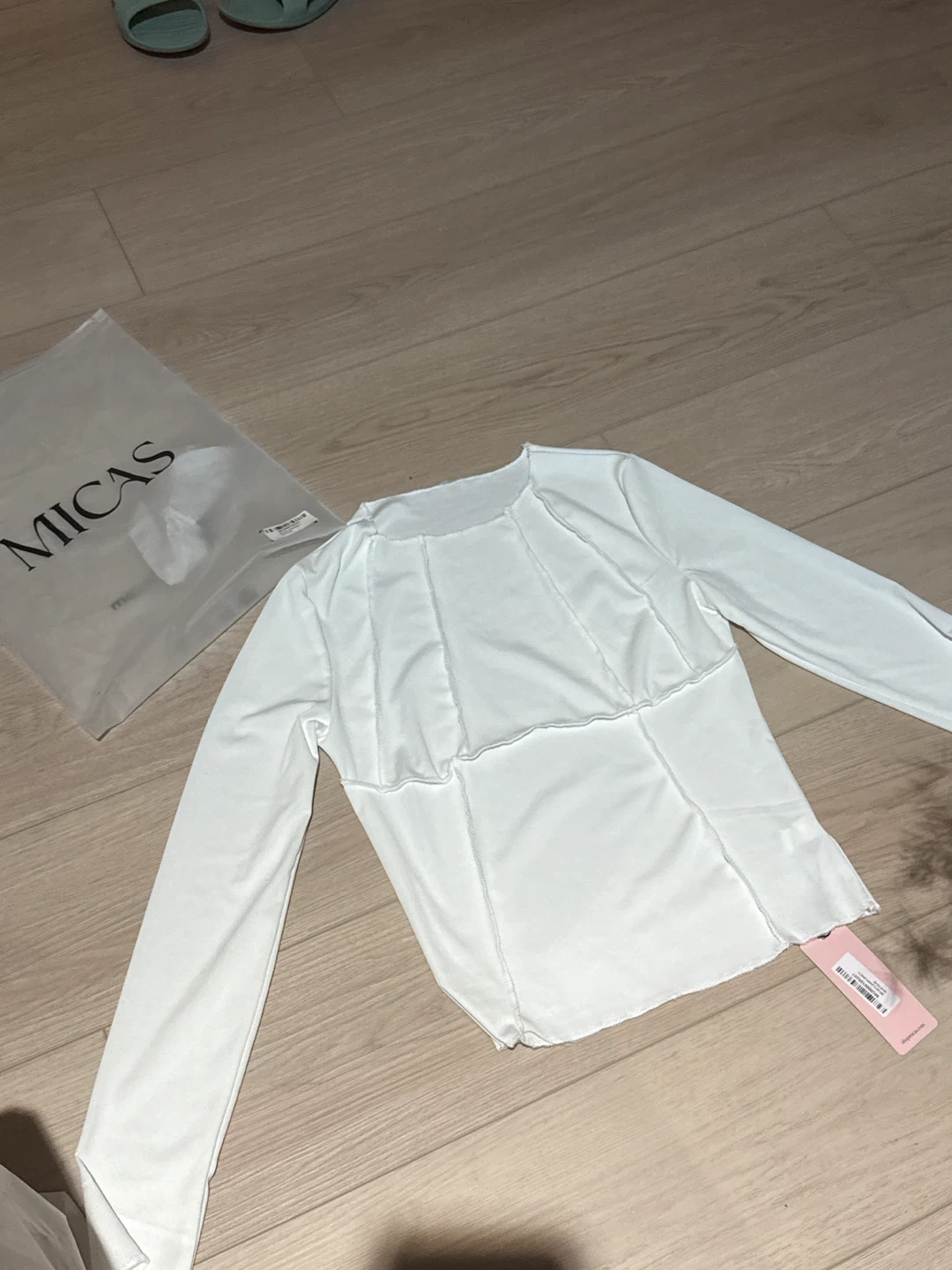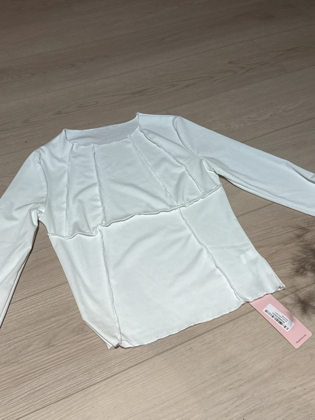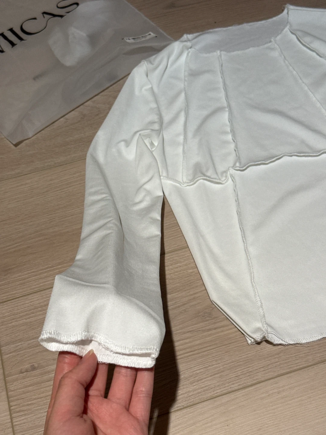 This is a white long sleeve top from MICAS. It's a size small with a panelled design and exposed stitching. Never worn before, not the material to my liking, tag and bag is still intact.