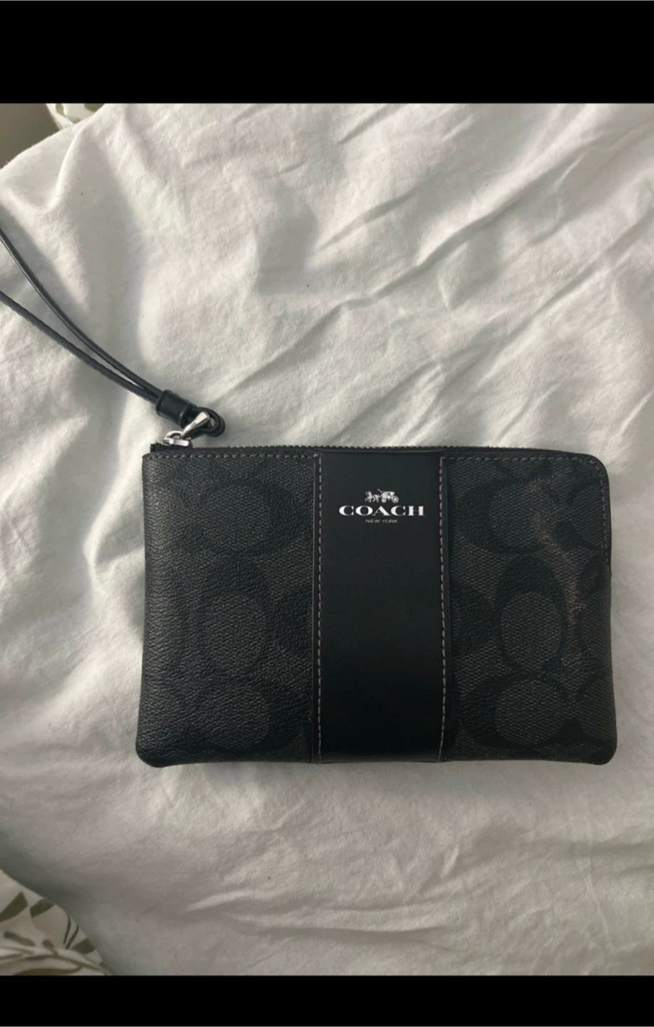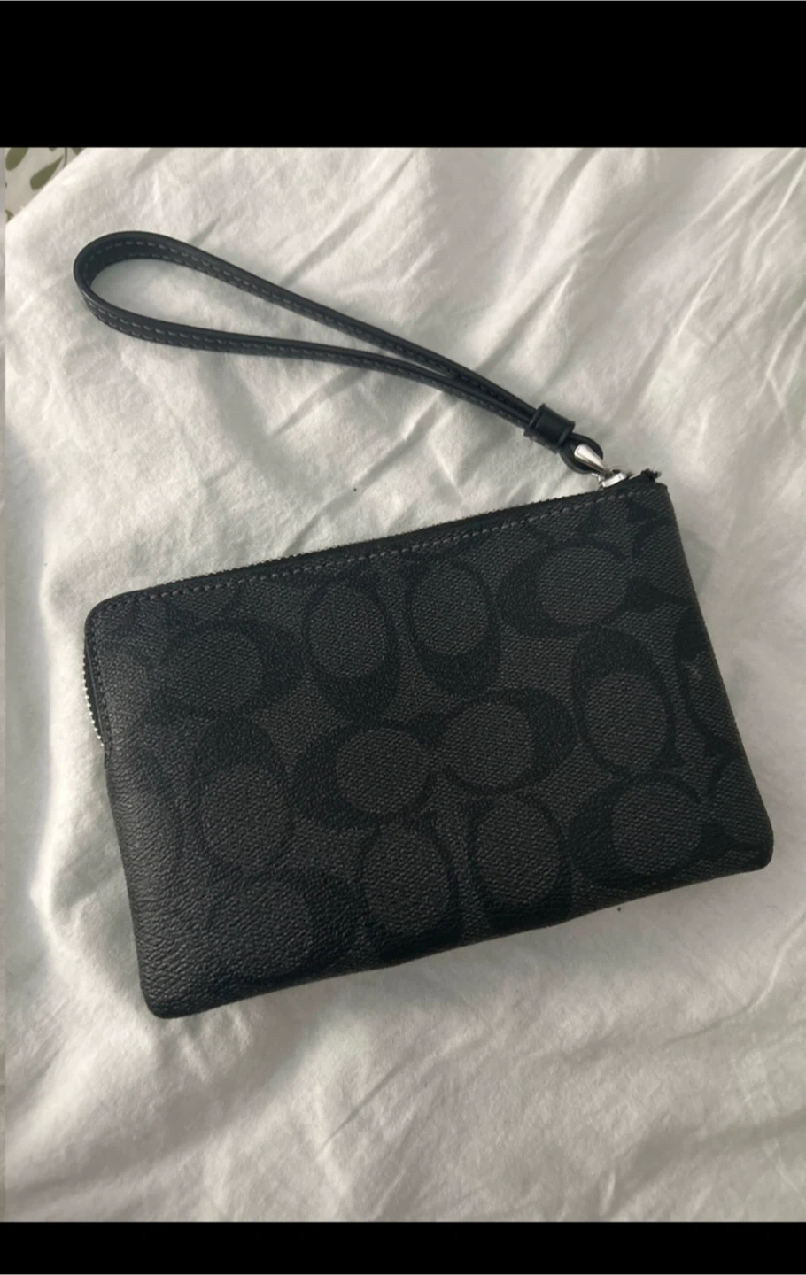 This is a black Coach wristlet pouch with their signature "C" pattern. It's made from coated canvas and has a leather trim. It also comes with a detachable wrist strap for easy carrying. This pouch is great for keeping your essentials organized!