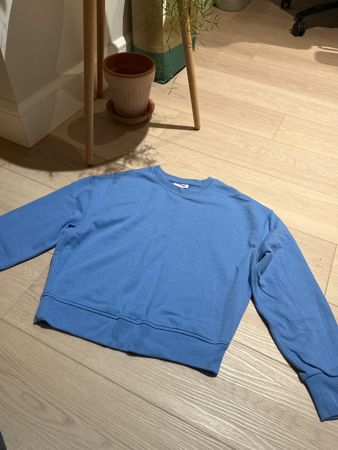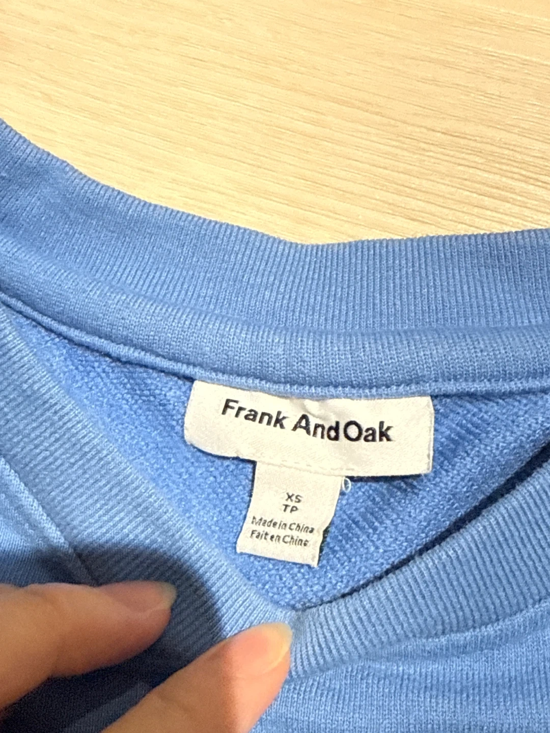 This is a Frank And Oak blue crewneck sweatshirt. It's a size XS. Unfortunately doesn’t fit me anymore but it’s rarely worn and no pills! Kept very pristine, very nice blue with a pop to the eye.