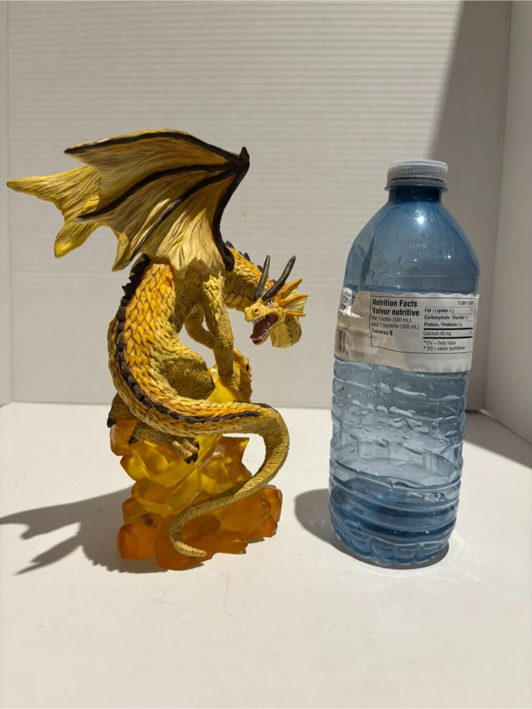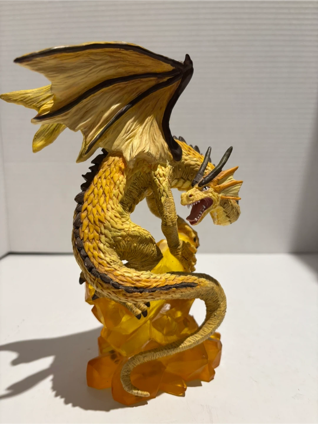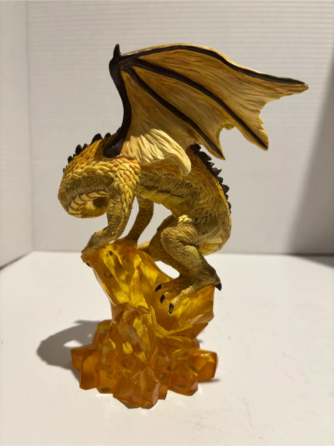 This is a detailed figurine of a yellow dragon perched on an amber-coloured crystal base. It's made of a durable resin material. This striking piece would make a great addition to a fantasy collection or desk decor.