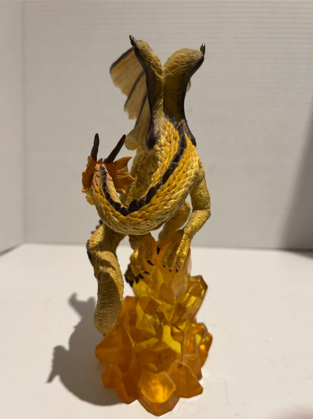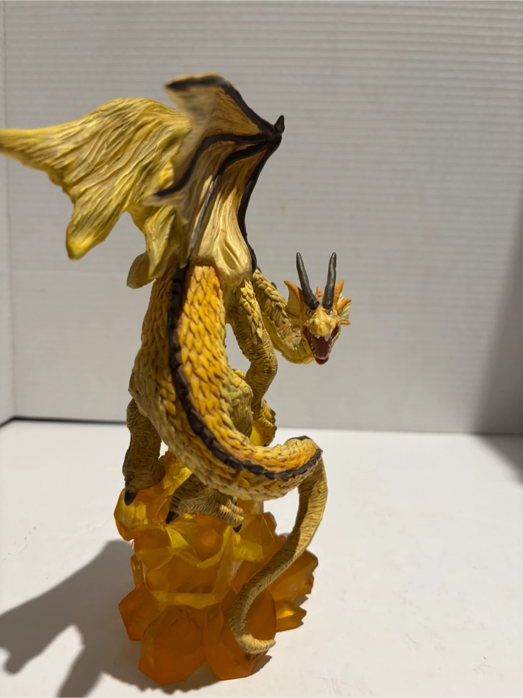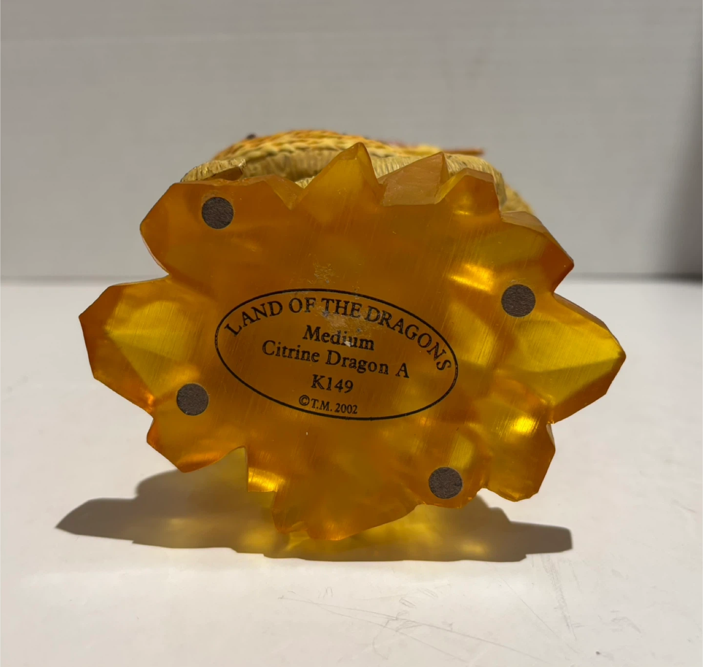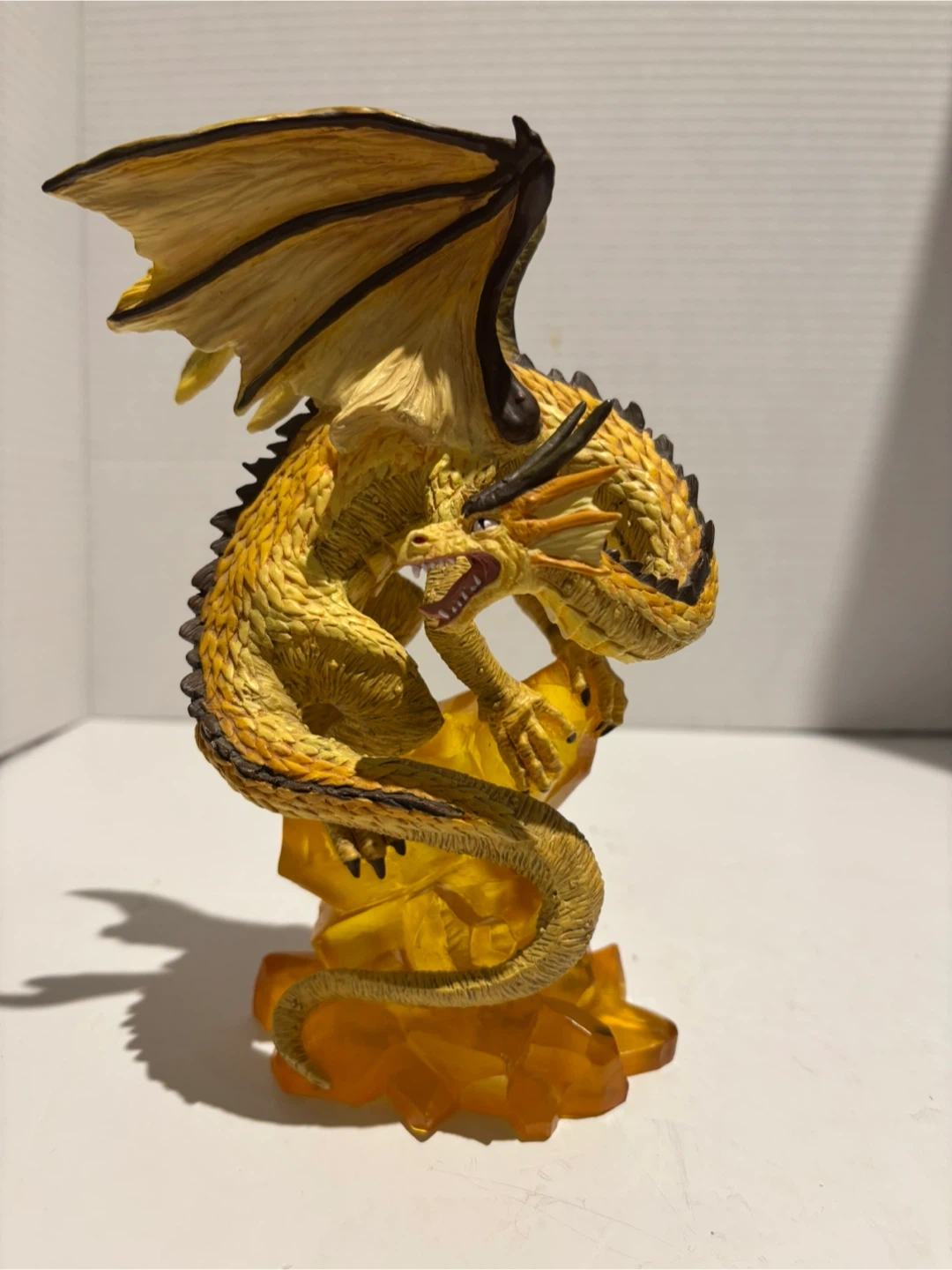 This is a detailed figurine of a yellow dragon perched on an amber-coloured crystal base. It's made of a durable resin material. This striking piece would make a great addition to a fantasy collection or desk decor.
