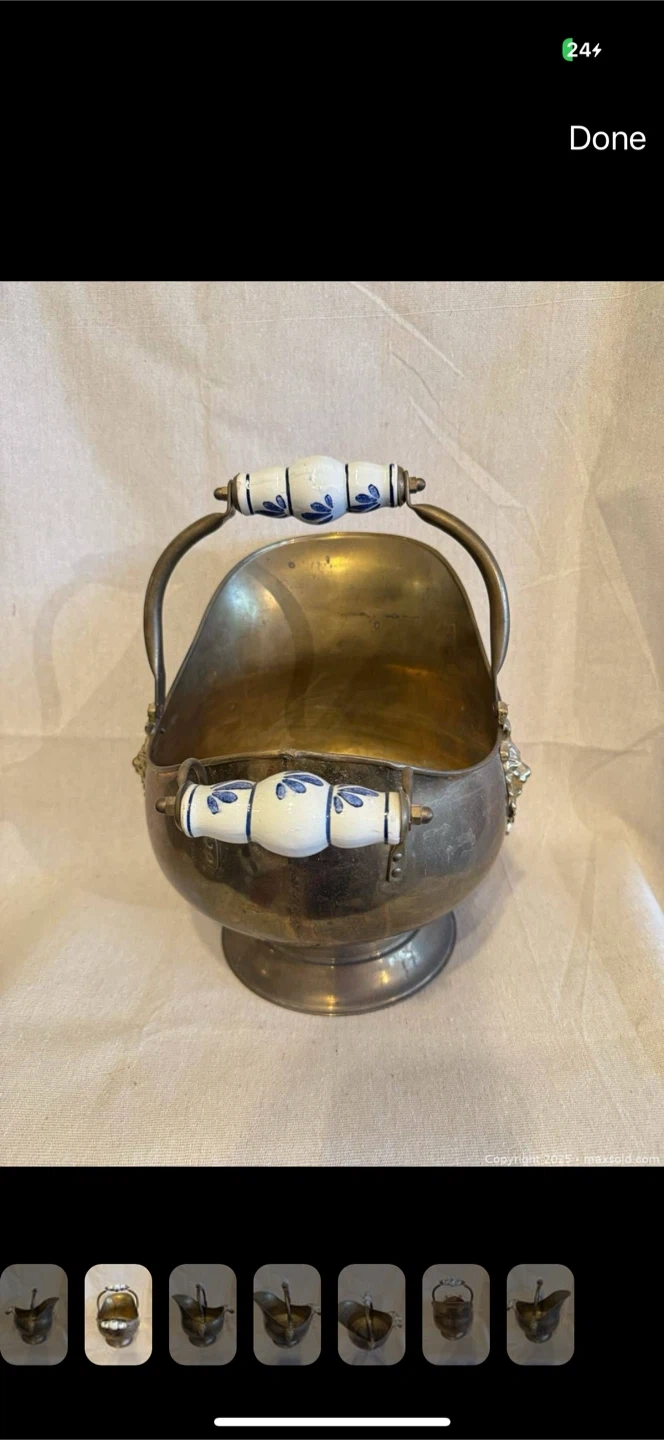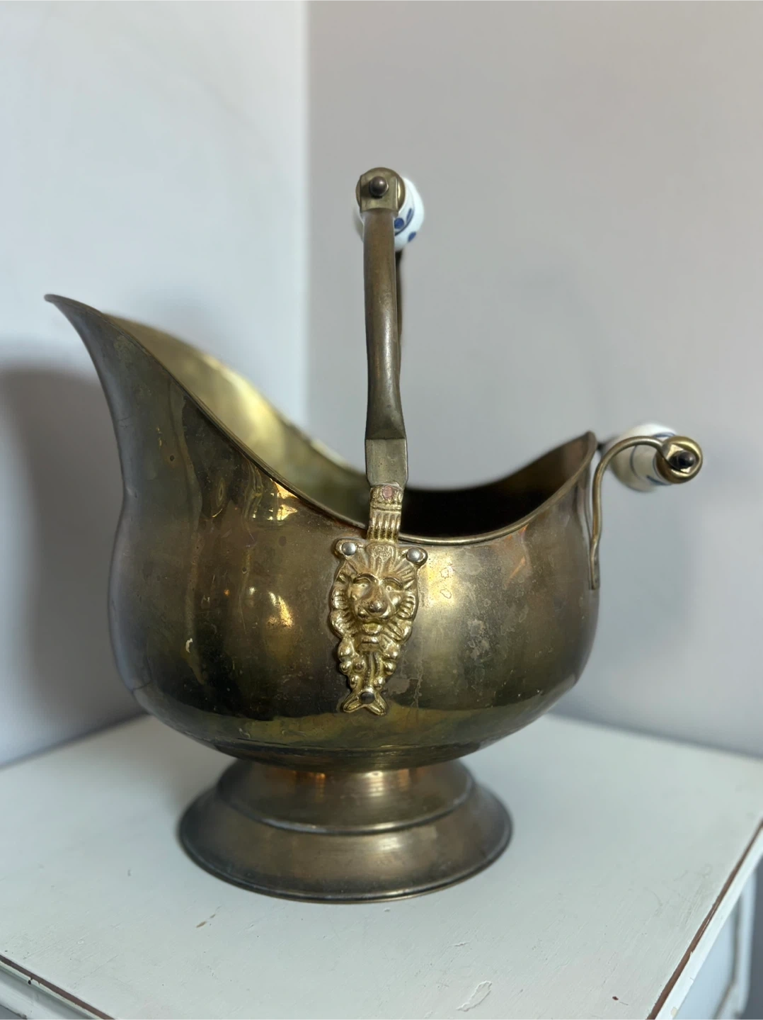 This antique brass coal scuttle features a charming lion's head embossed on the front. It has decorative porcelain handles with blue floral accents. It's perfect for keeping your fireplace tidy and stylish.