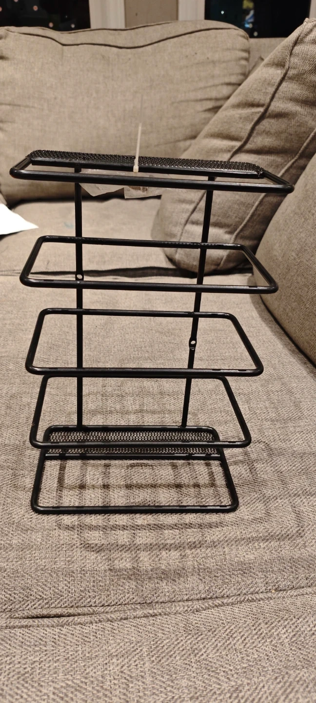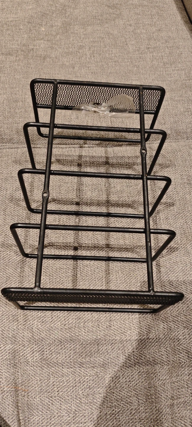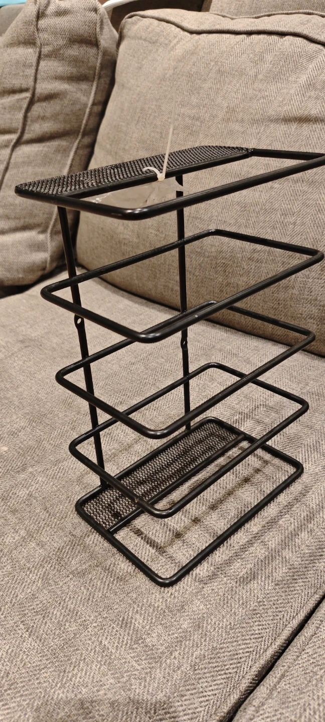 This black metal desk organizer has four tiers for sorting mail or office supplies. It's made of durable metal wire construction. This organizer would be handy for keeping your desk or entryway tidy!