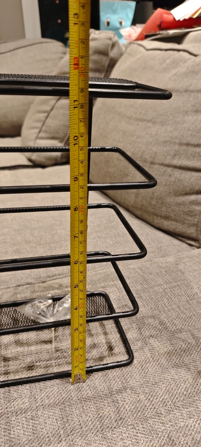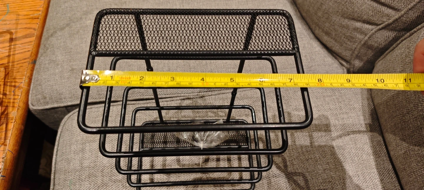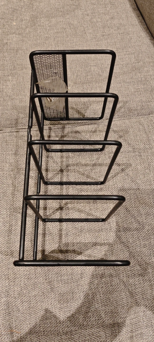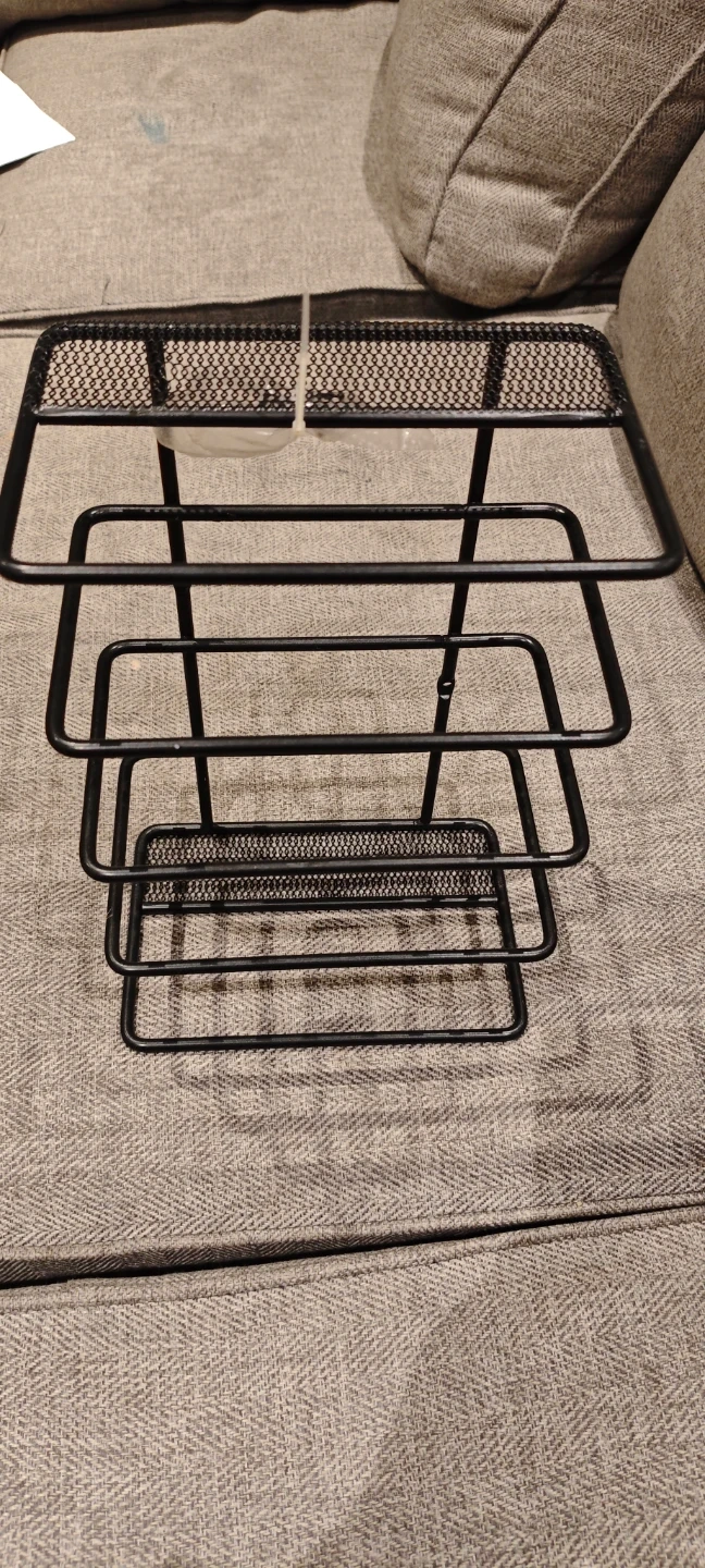 This black metal desk organizer has four tiers for sorting mail or office supplies. It's made of durable metal wire construction. This organizer would be handy for keeping your desk or entryway tidy!
