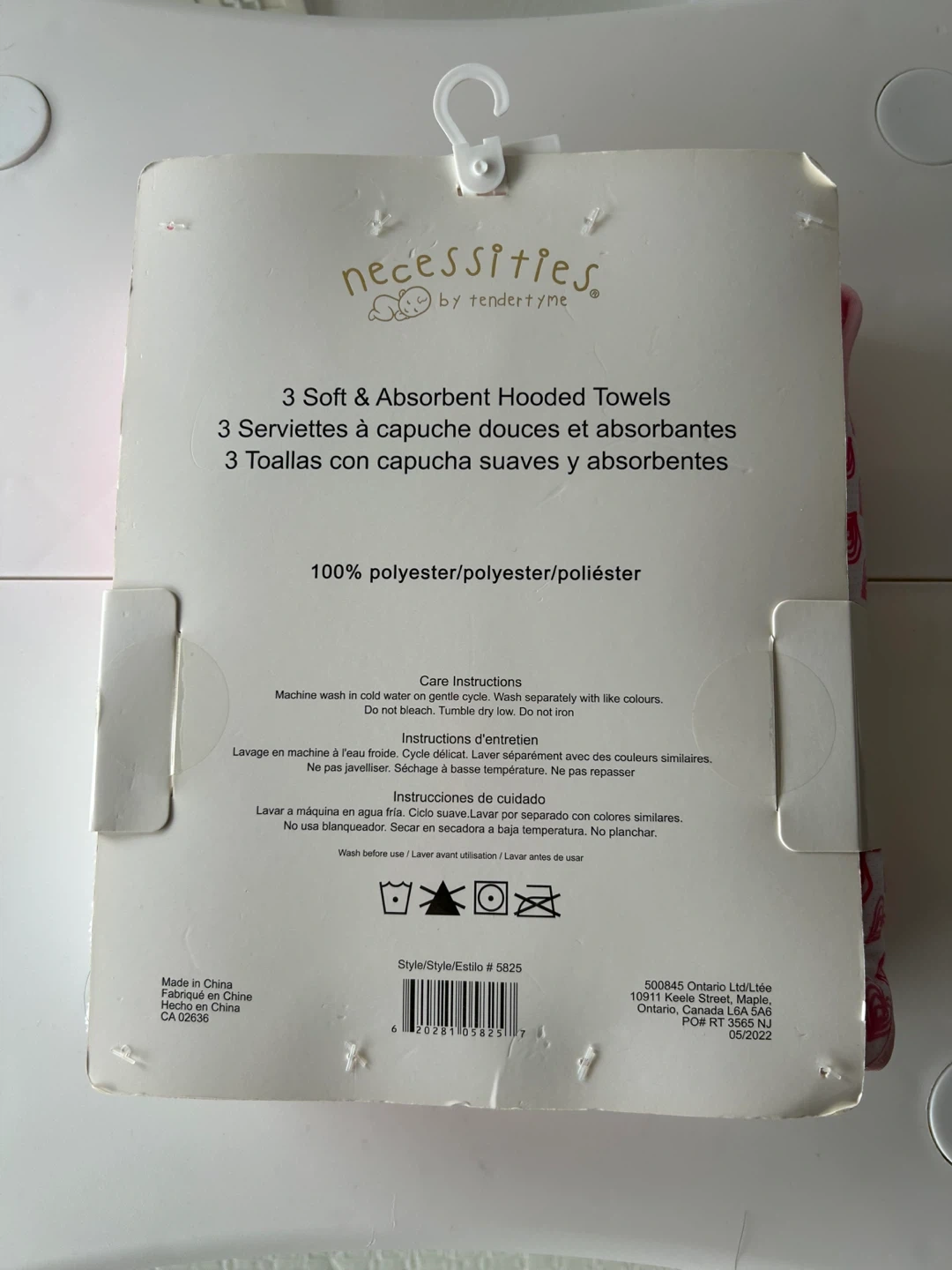 This set includes three soft and absorbent hooded towels. They're made of 100% polyester. Includes one white towel with pink embroidery, and two towels with pink heart patterns.