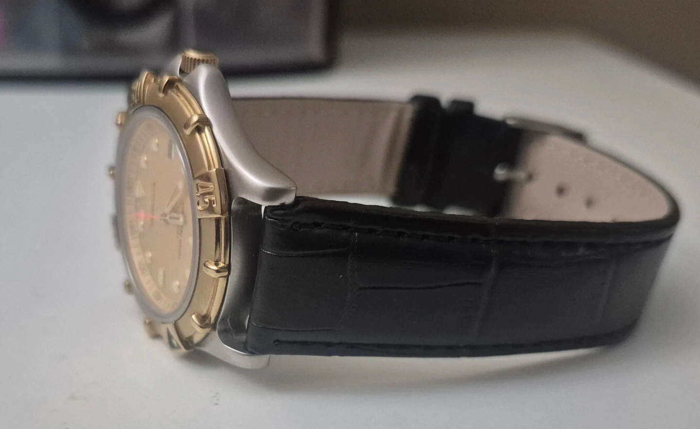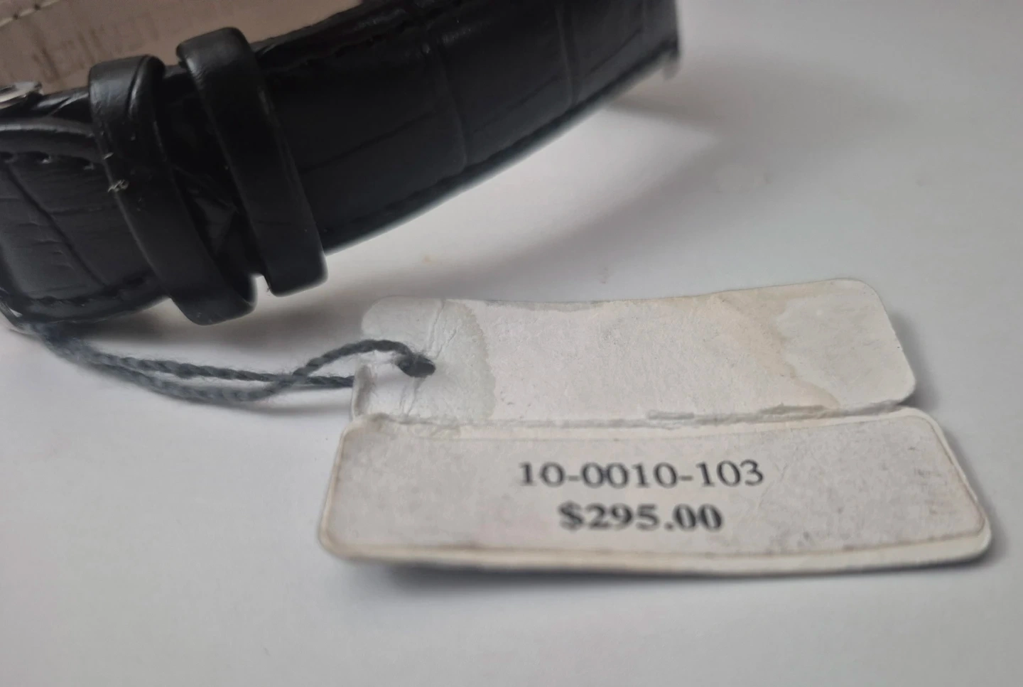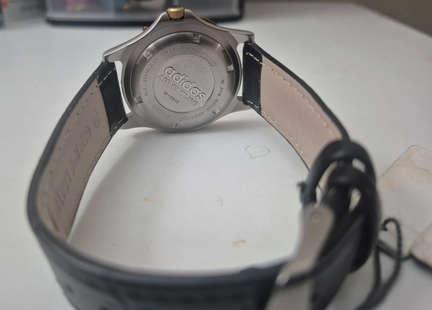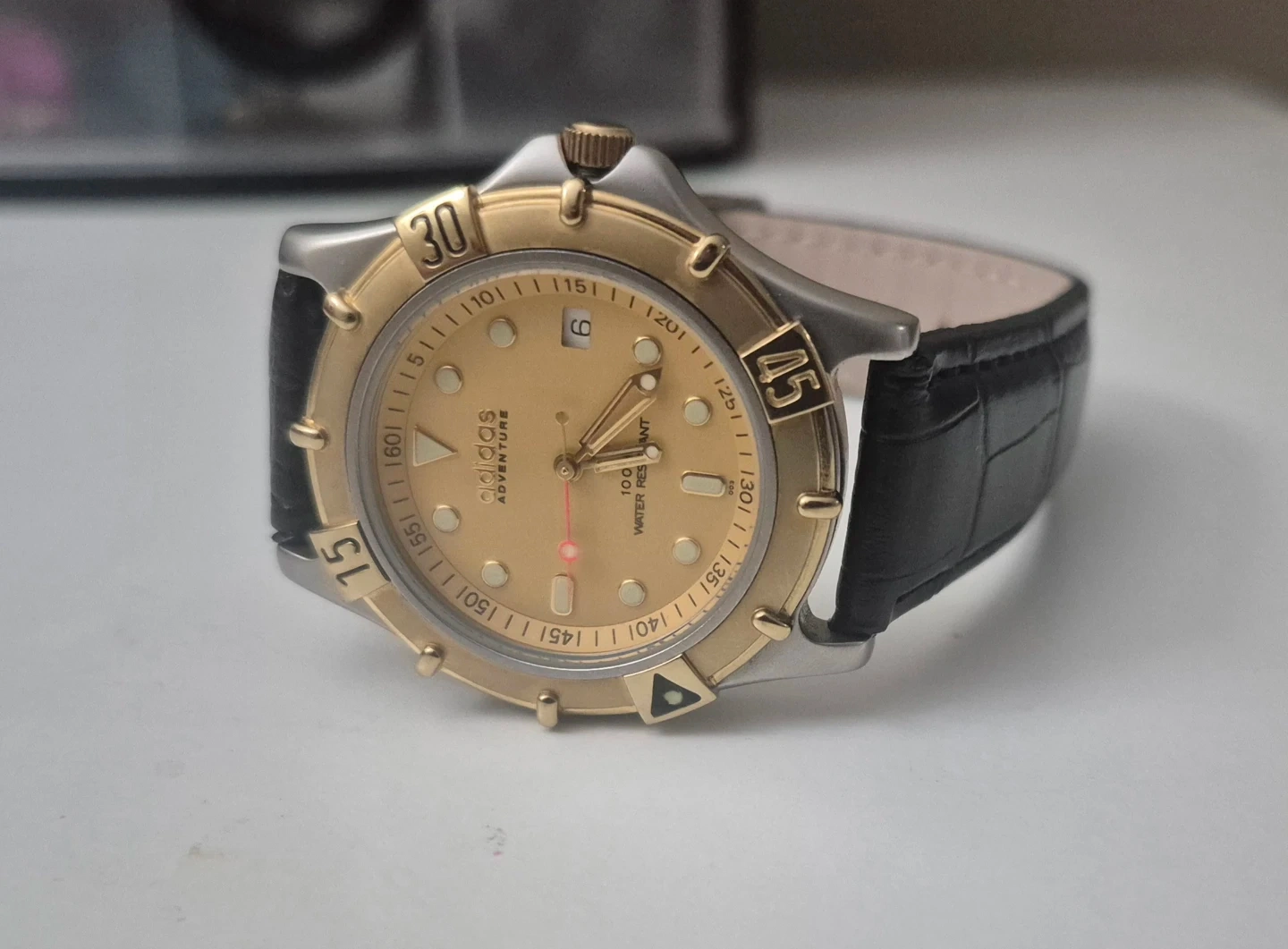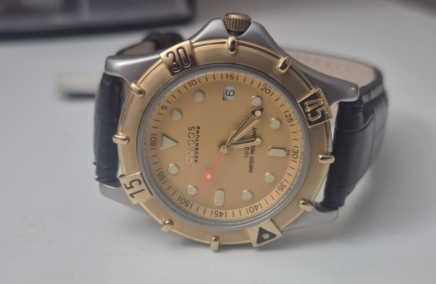 This Adidas Adventure watch features a gold-tone face and a black leather band. It's water-resistant up to 10 ATM. The original price was $295.00.