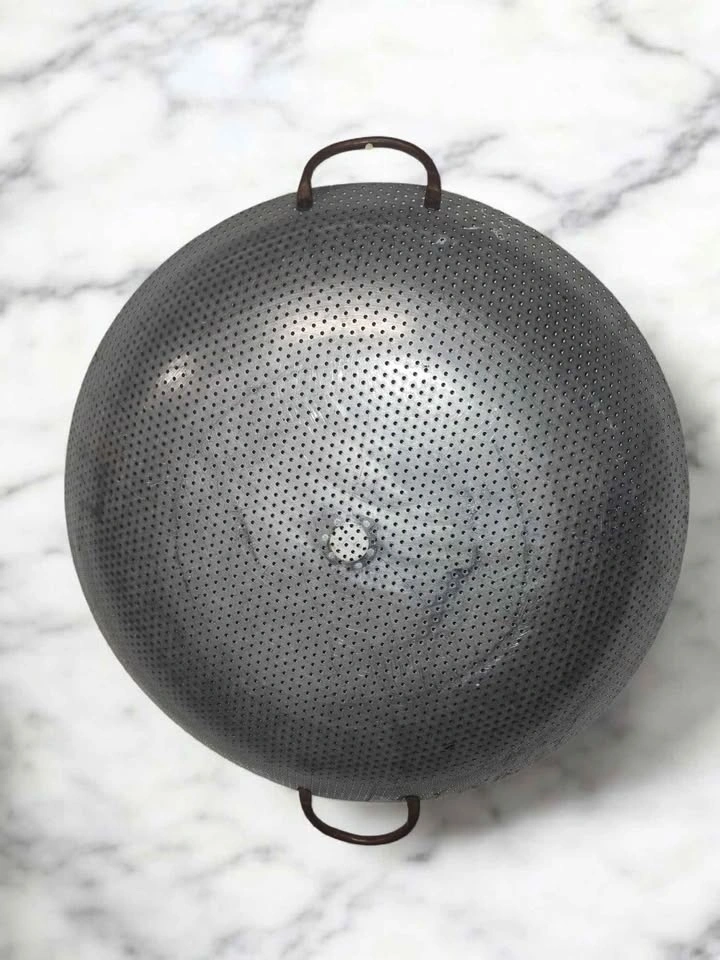 Extra large, 25-inch round strainer with two handles, 4 inches deep. Perforated aluminum, often used as a colander or sieve for cooking and canning. Also similar to a perforated steam table pan for draining and steaming food.