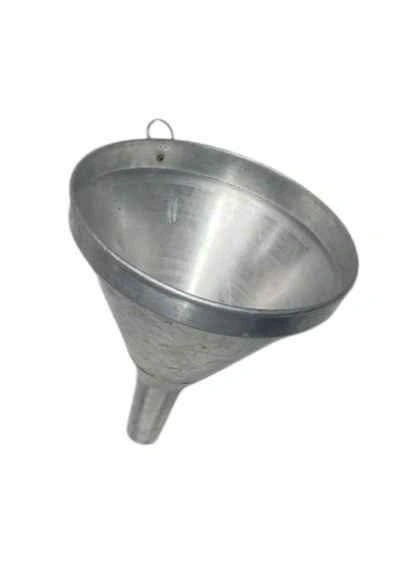 11-inch metal funnel with a handle, useful for pouring liquids or fine-grained ingredients into containers with small openings. The handle helps hold it steady.