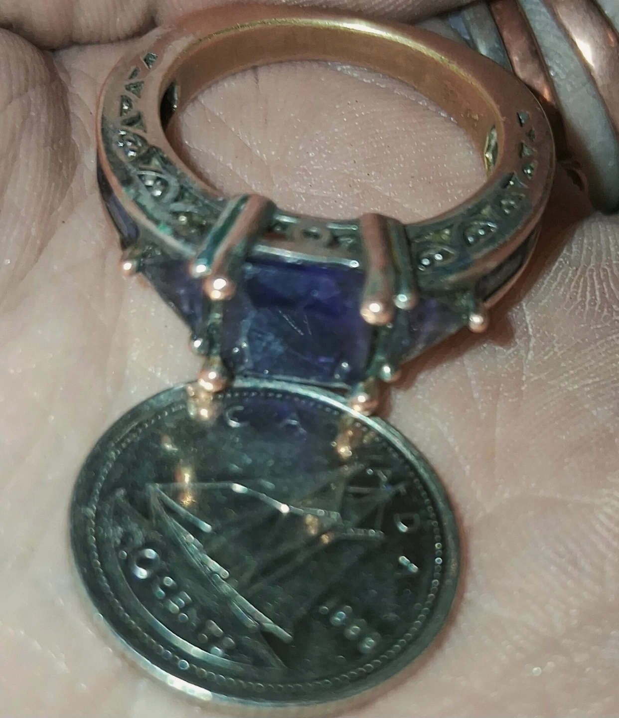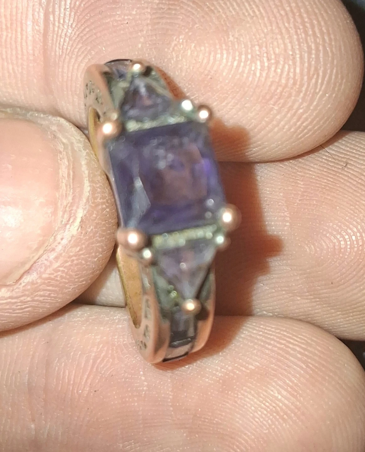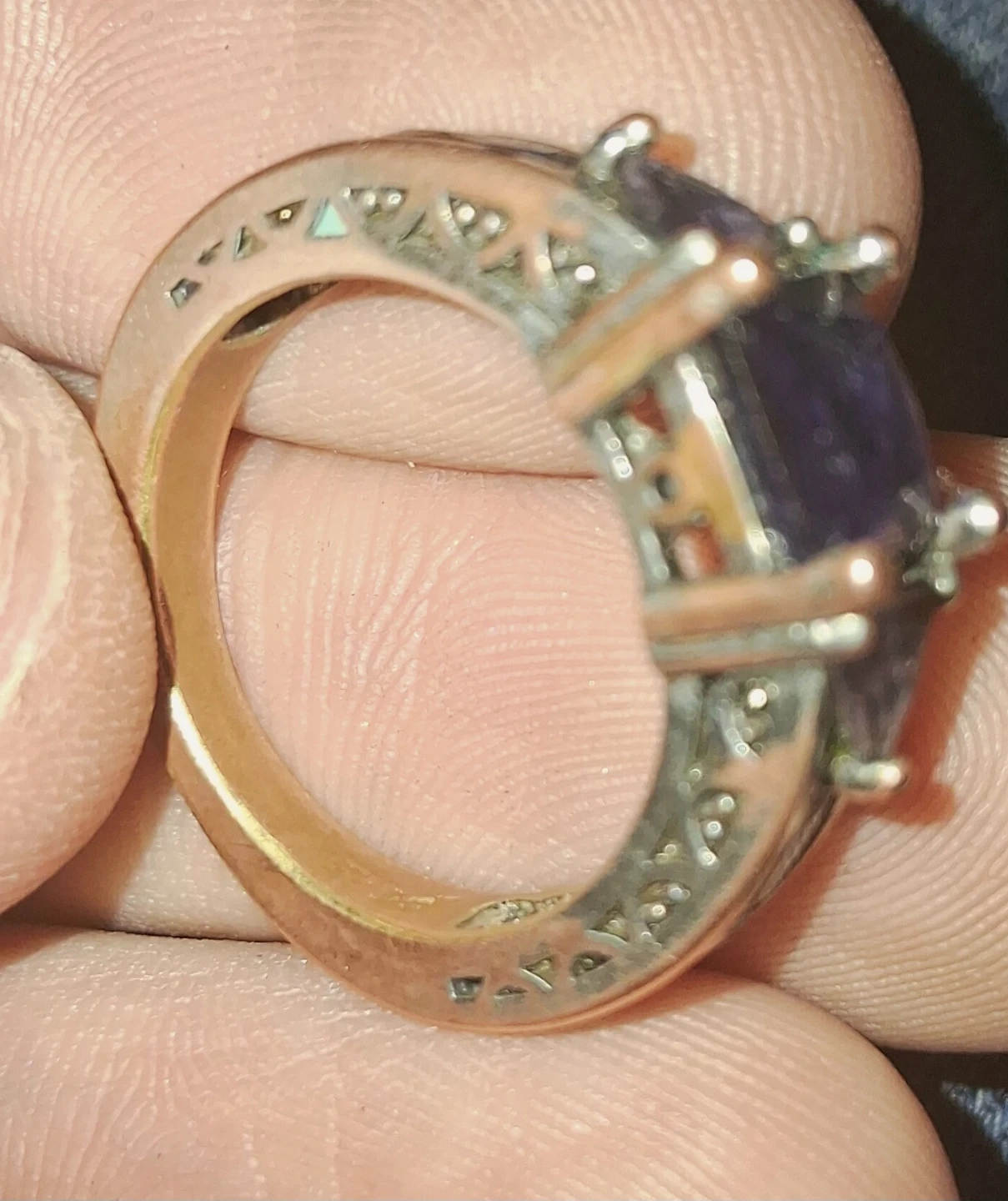 This ring features a striking purple amethyst stone set in a detailed metal band. A conversation starter, for sure! Coin is for size comparing. Pick up only unless near intersection of Oxford and Gammage Street.