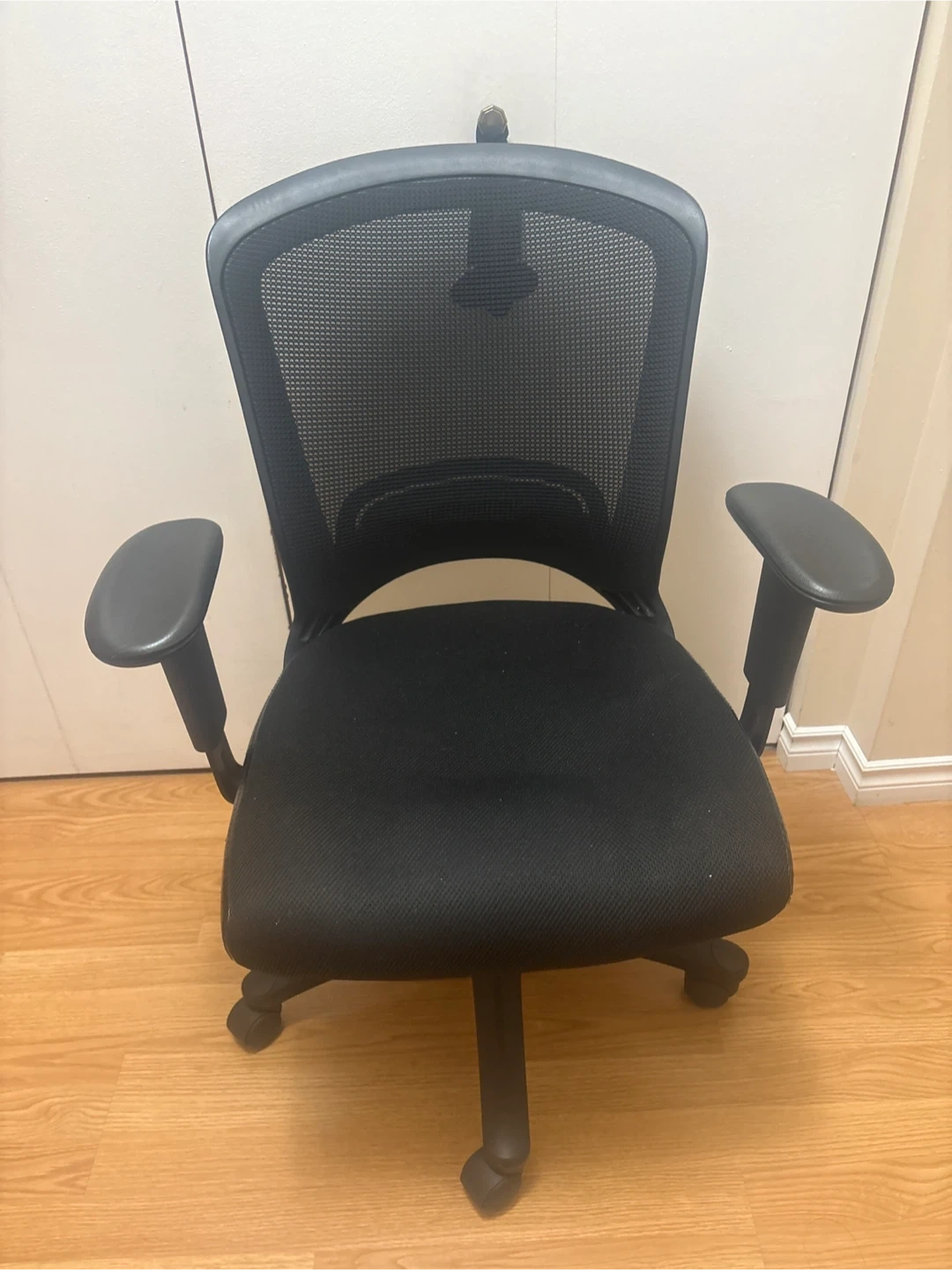 This is a black mesh office chair with adjustable arms. It's a comfortable option for your workspace. The chair has a mesh back for breathability and a padded seat. It's on wheels for easy movement.