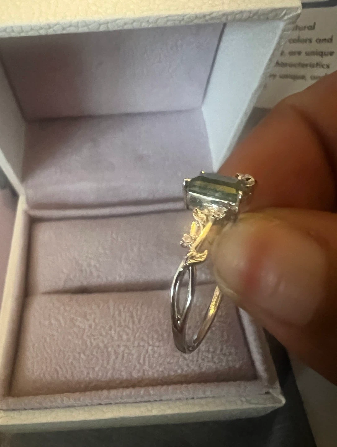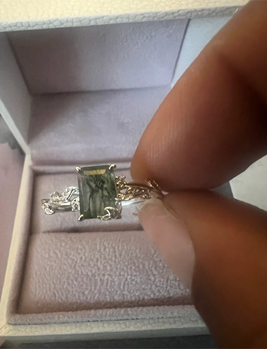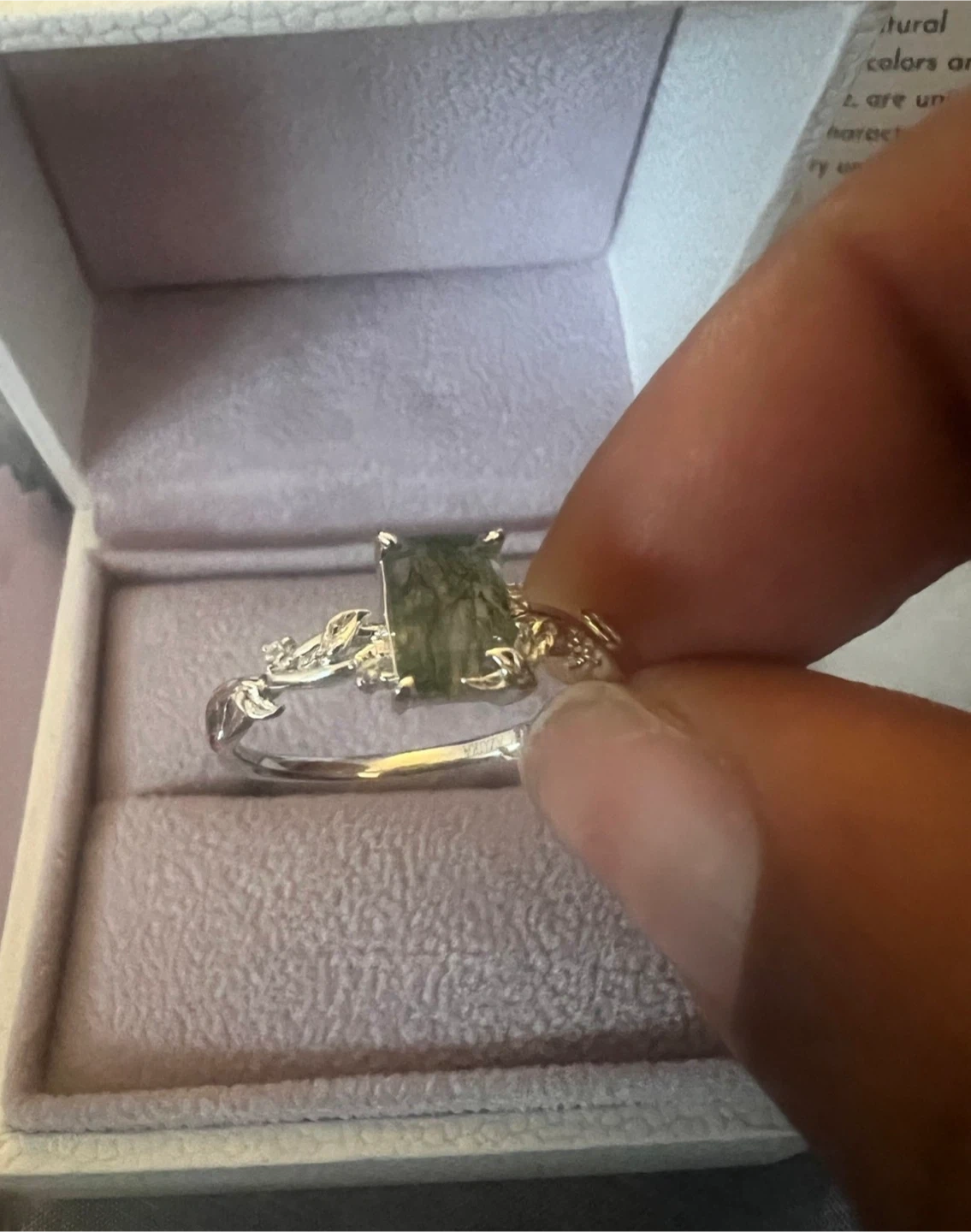 10K White Gold ring featuring a rectangular moss agate gemstone. It comes with the original Azura Jewelry New York box, a jewelry care guide, and a polishing cloth. This ring showcases a unique, natural stone.