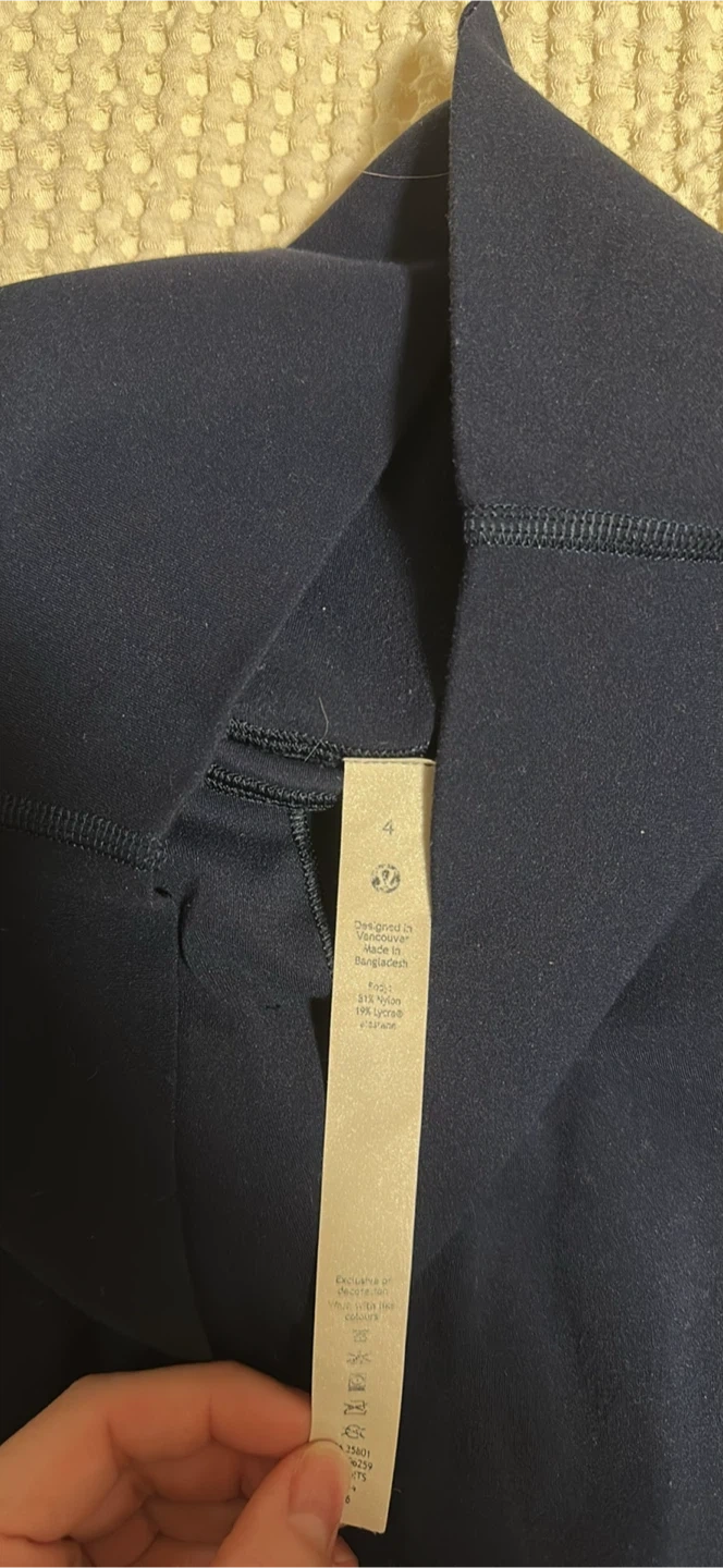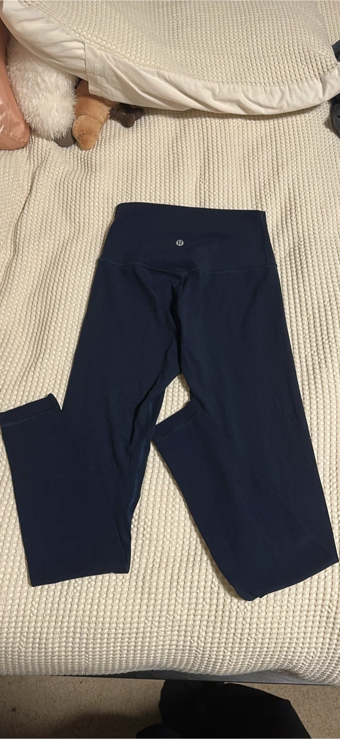 Navy blue Lululemon leggings, size 4. These are designed for yoga and are made with a comfortable, stretchy material. They're perfect for workouts or everyday wear!
