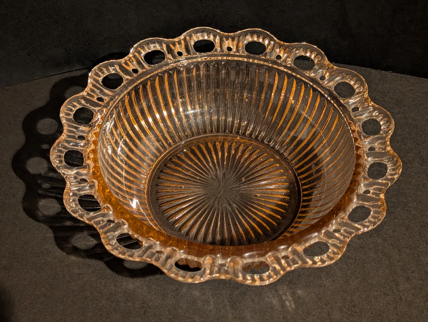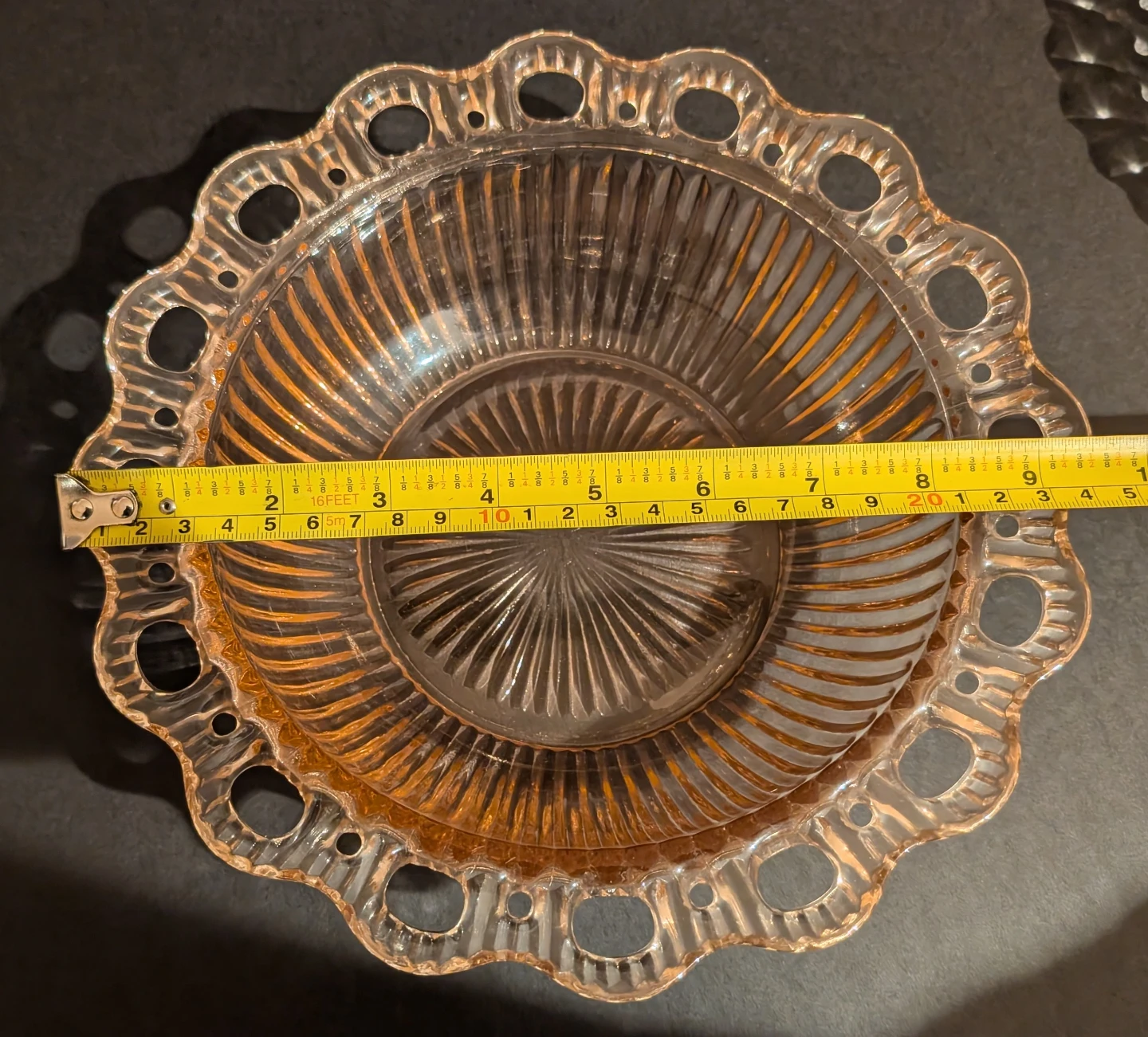 Beautiful pink Depression glass bowl with a decorative lace-like edge, Anchor Hocking Old Colony pattern. This piece measures 9.5 inches in diameter and 2.5 inches tall. This piece is in great condition.