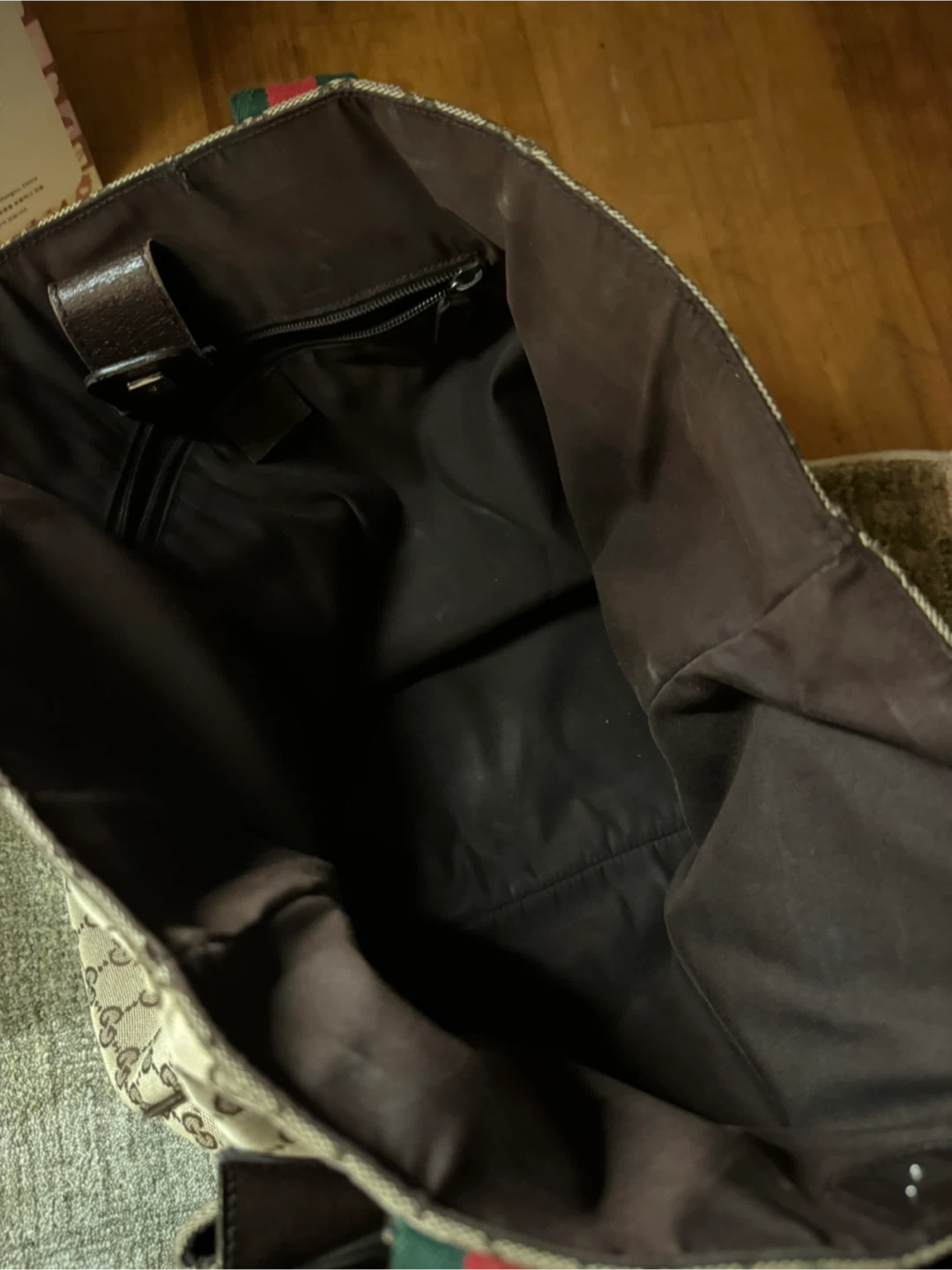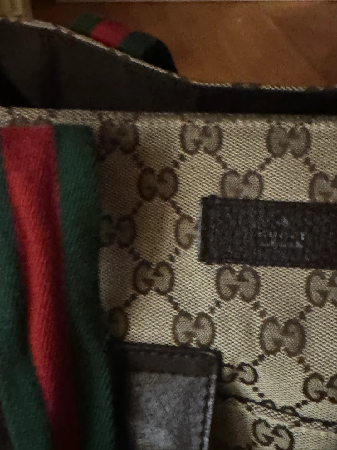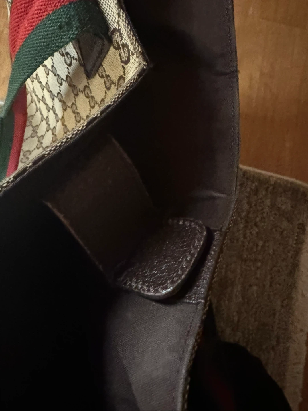 Authentic vintage Gucci tote back with red & green canvas straps from Y2K Tom Ford Era. GG canvas, eather pocket detail and magnetic snap closure.