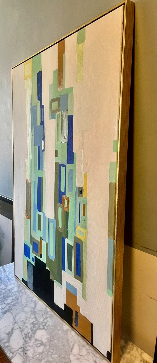 A modern abstract painting featuring a geometric design with a palette of blues, greens, and earthy tones. It's framed in a sleek gold-coloured metal frame. This piece adds a contemporary touch to any room!