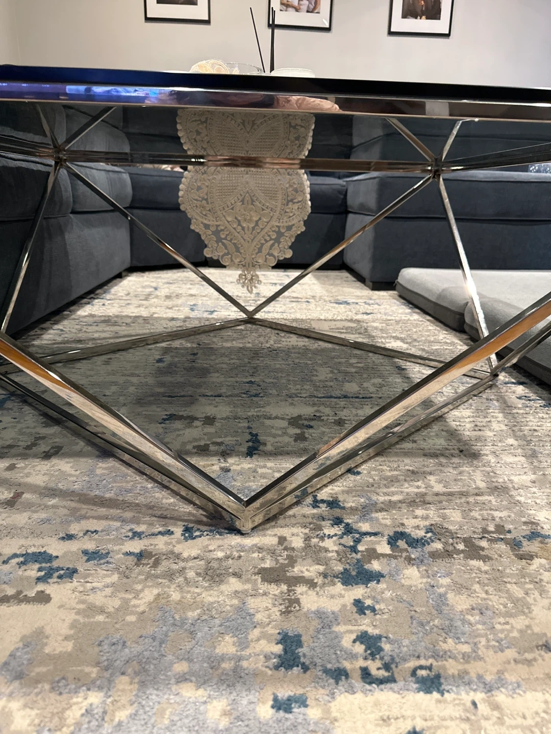 Modern coffee table with a sleek glass top and a geometric chrome base. It's a stylish addition to any living room! The reflective surface adds a touch of elegance to your space.