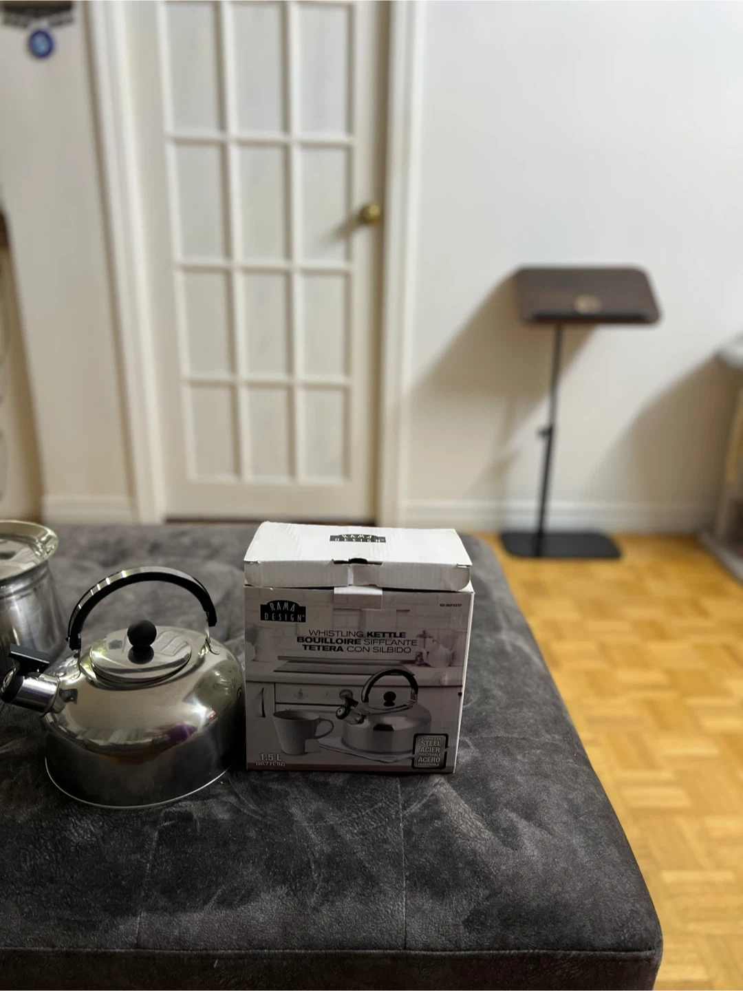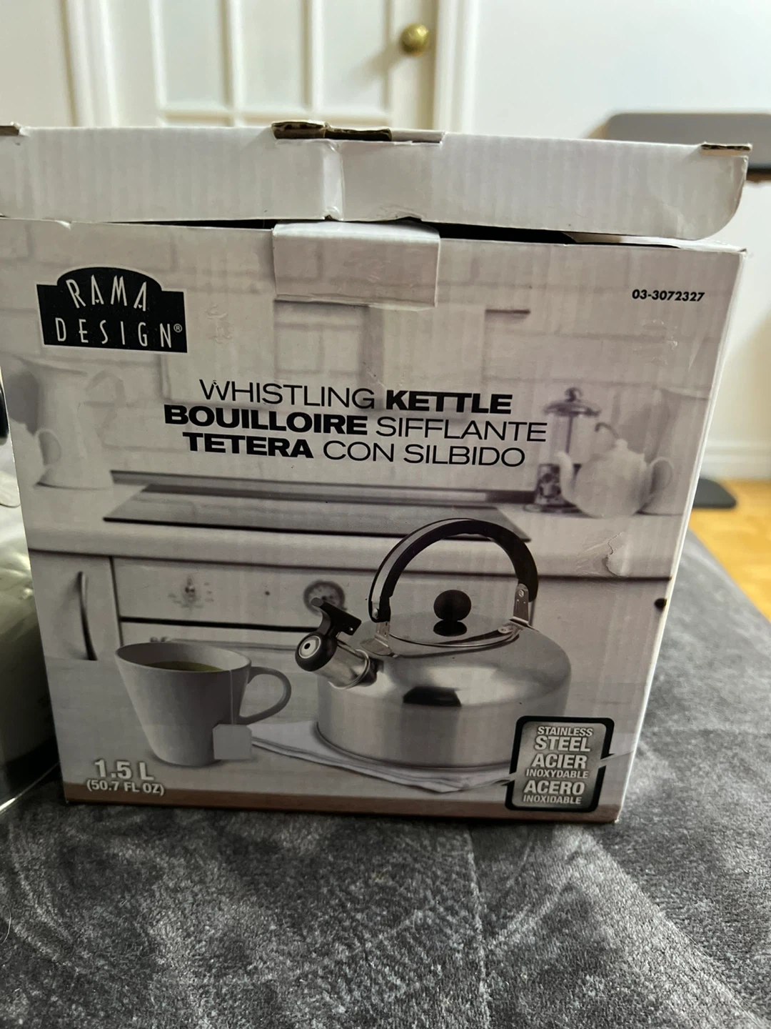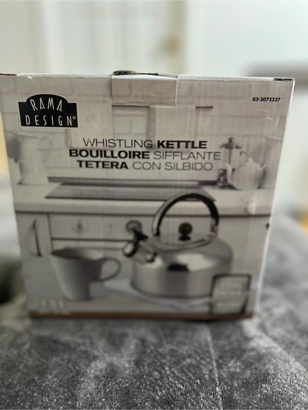 This is a new Rama Design whistling kettle with a 1.5L capacity. It's made of stainless steel for durability. This kettle whistles when the water is boiling, letting you know it's ready!