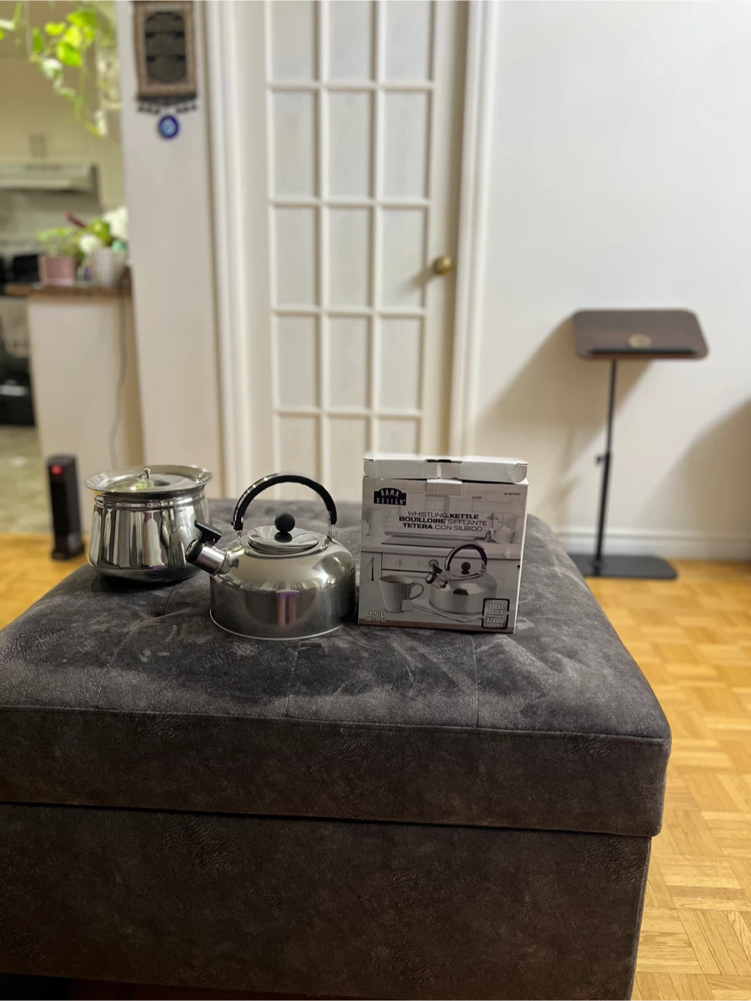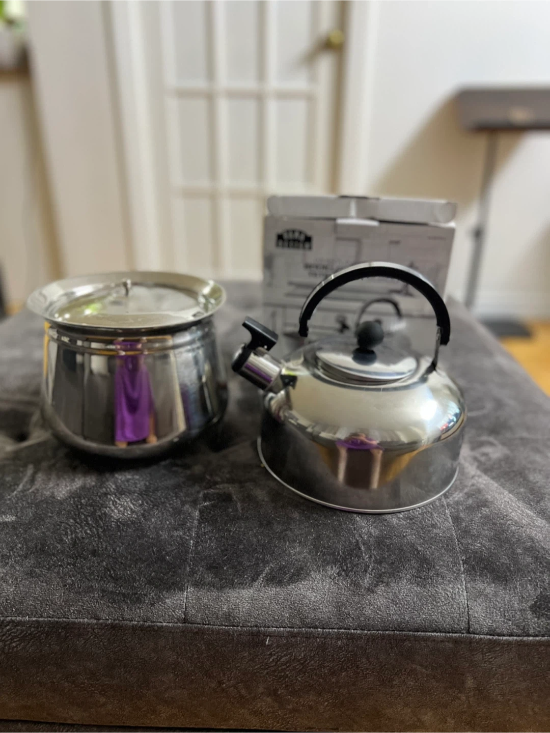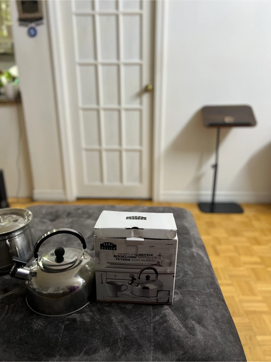 This is a new Rama Design whistling kettle with a 1.5L capacity. It's made of stainless steel for durability. This kettle whistles when the water is boiling, letting you know it's ready!