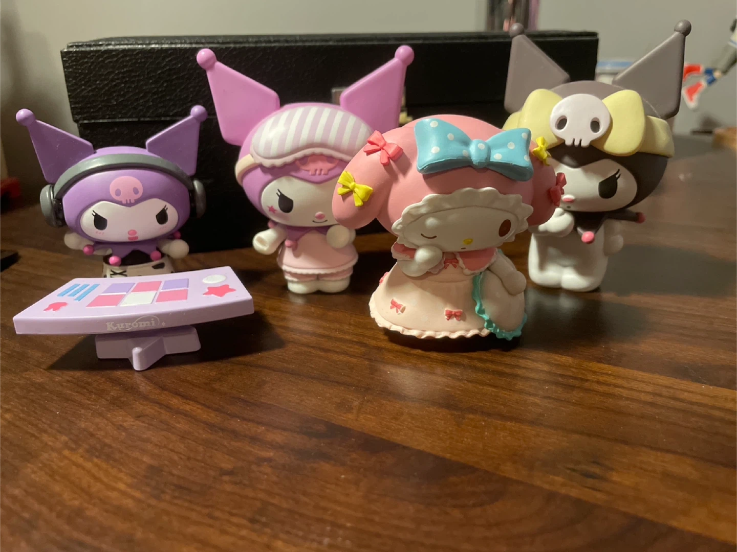 Four Sanrio character figurines including My Melody and Kuromi. Includes a small purple table accessory with 'Kuromi' printed on it. These figures are made of plastic.