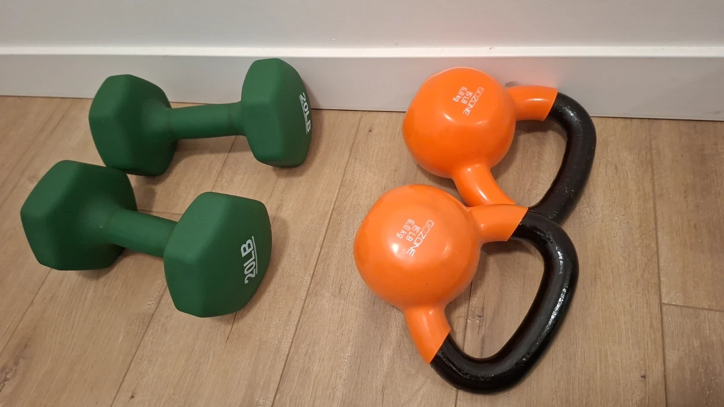 Two green 20lb dumbbells and two orange GoZone kettlebells, each weighing 6.8 kg / 15lb. The kettlebells have black handles.