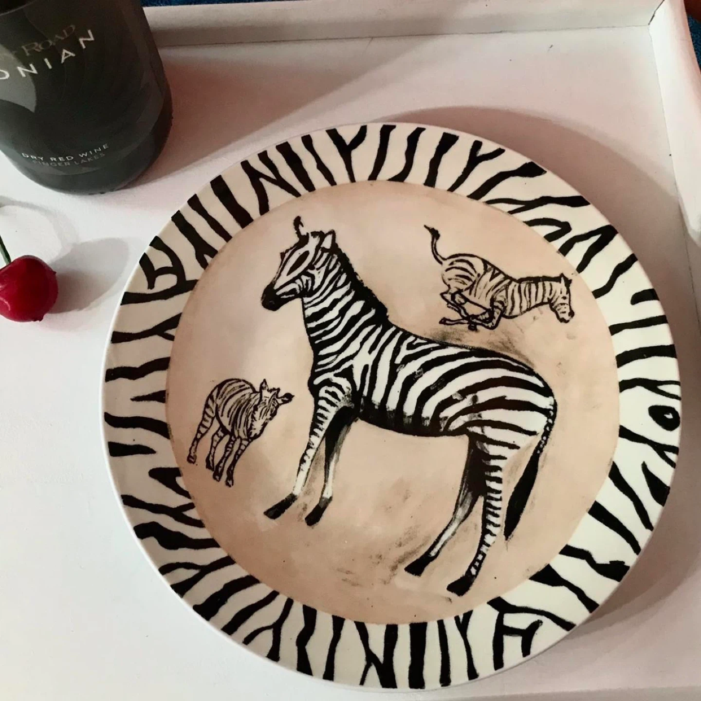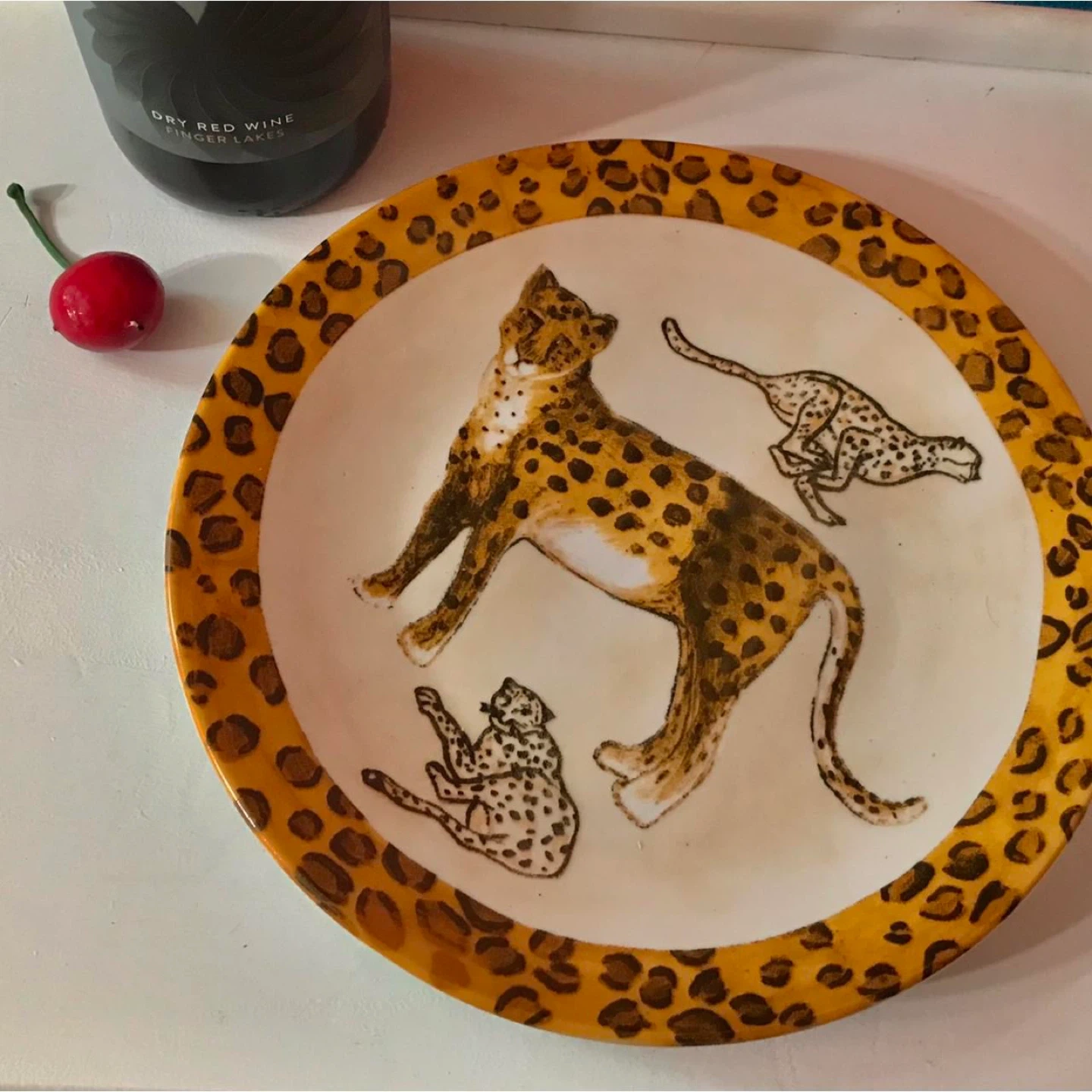 Two decorative plates feature unique animal designs. One plate showcases leopards with a leopard print border, and the other displays zebras with a zebra stripe border. These plates add a touch of wild charm to any decor!