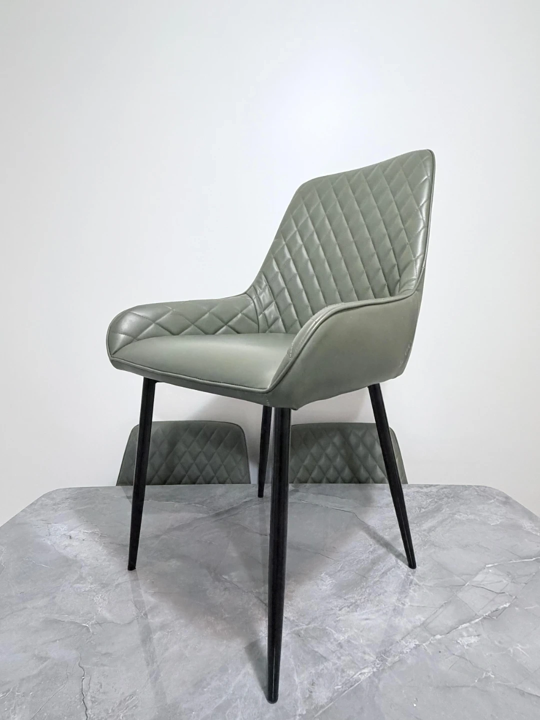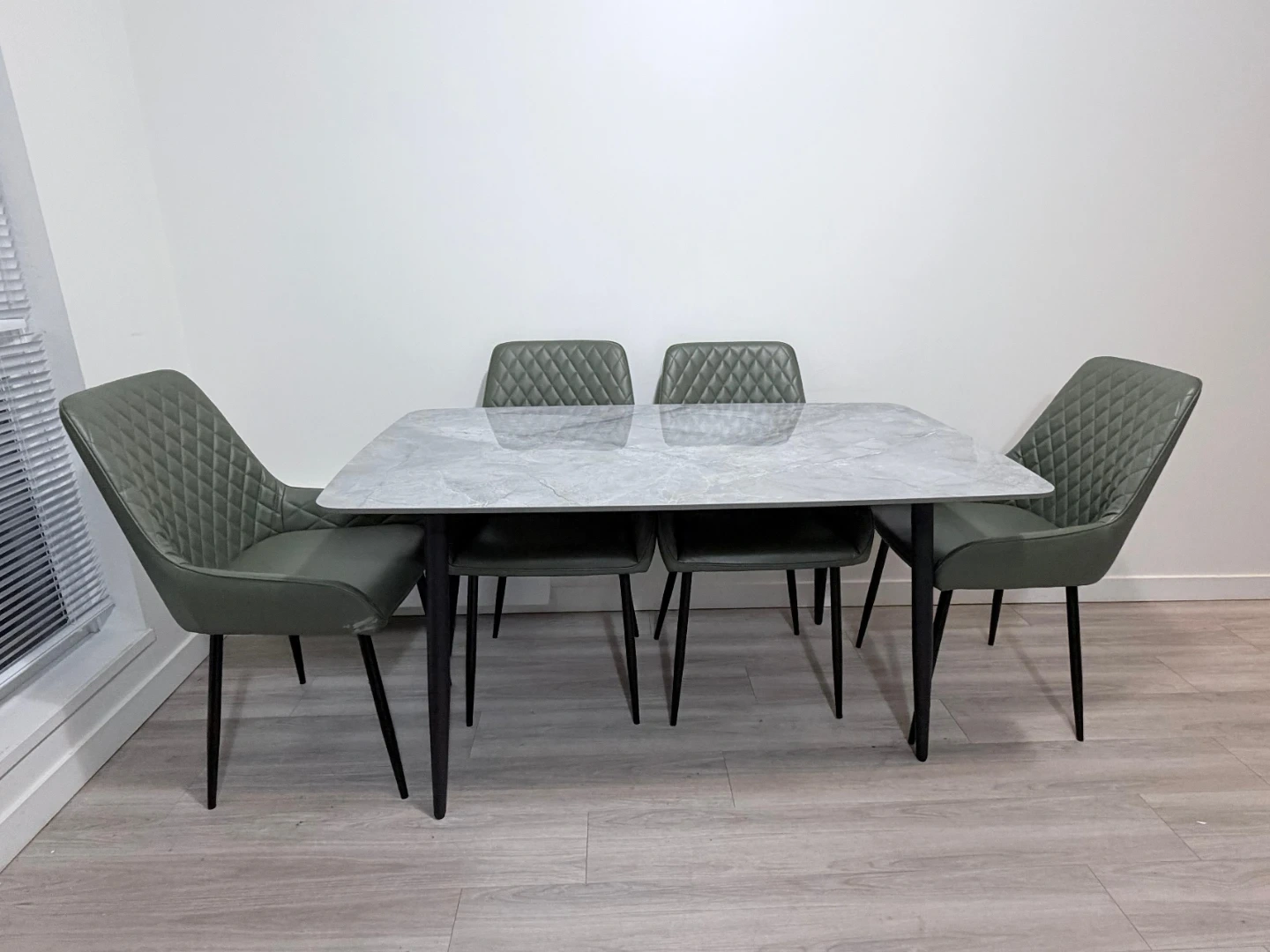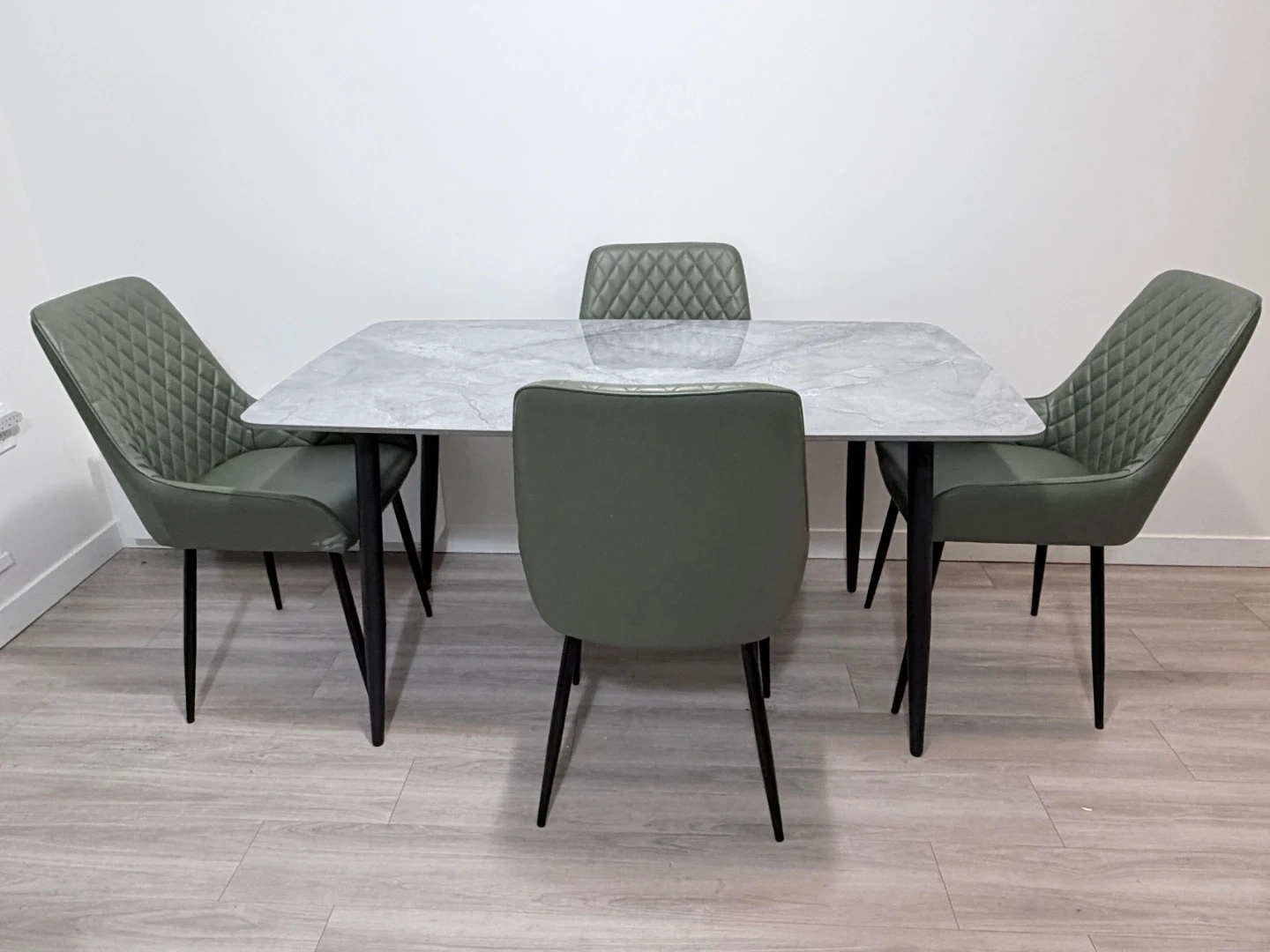 This set includes a marble-look dining table and four upholstered chairs. The chairs have a quilted diamond pattern and black metal legs. It's a stylish option for a kitchen or dining area, perfect for a small are. Can be sold together or separately