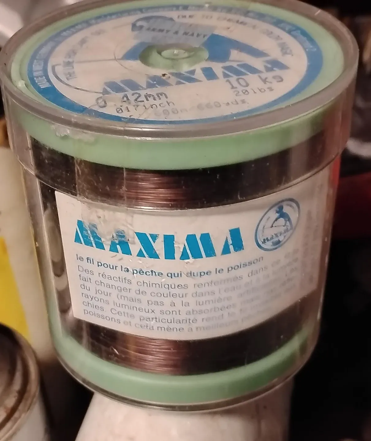 Maxima fishing line, 10 kg test strength. It's 0.42mm in diameter, about 20 lbs test. This line has chemical agents that change colour in water and light.