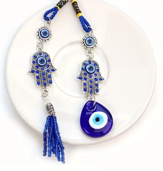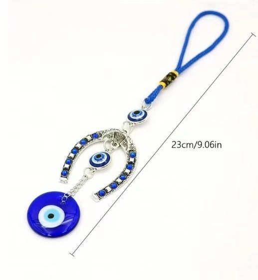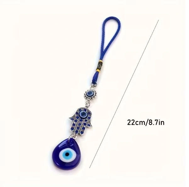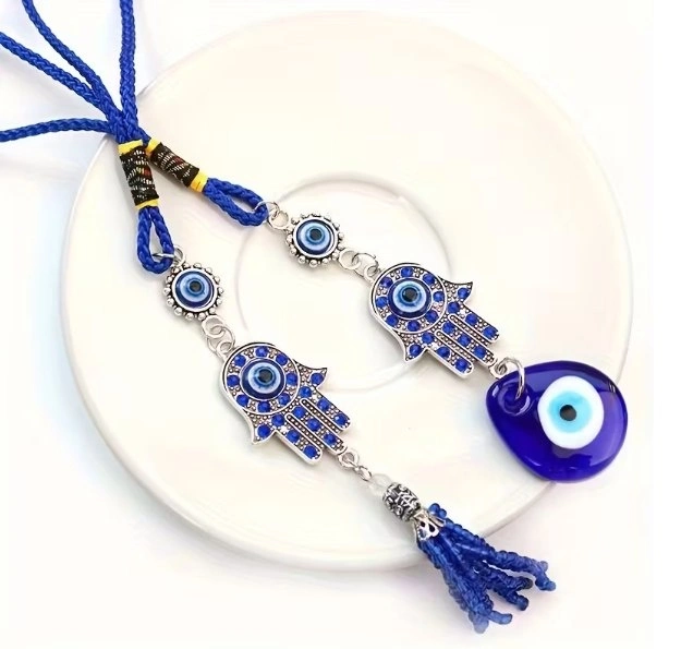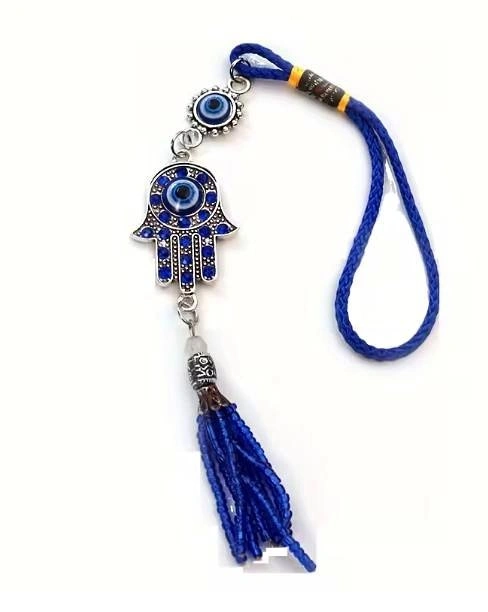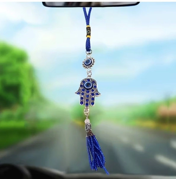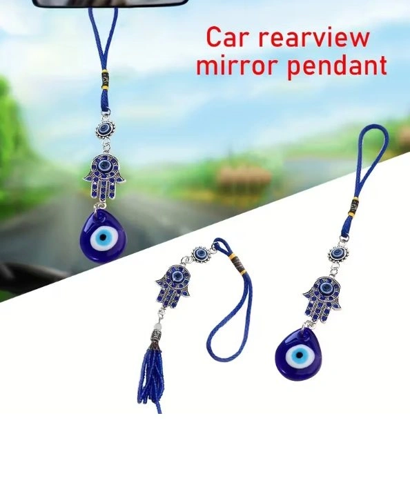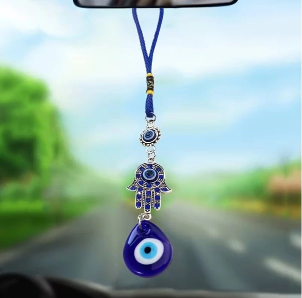 A decorative charm for car rearview mirrors featuring a diamond-studded evil eye. Suitable for all vehicles.