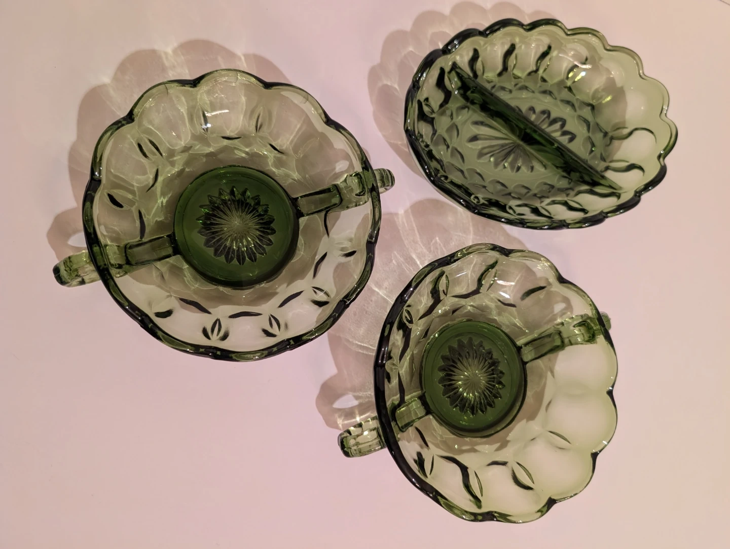 Set of vintage Anchor Hocking Fairfield Avocado green glass serving dishes. Includes 2 bowls with a fluted edge and handles and one larger oval divided dish. Great for serving snacks or small dishes!