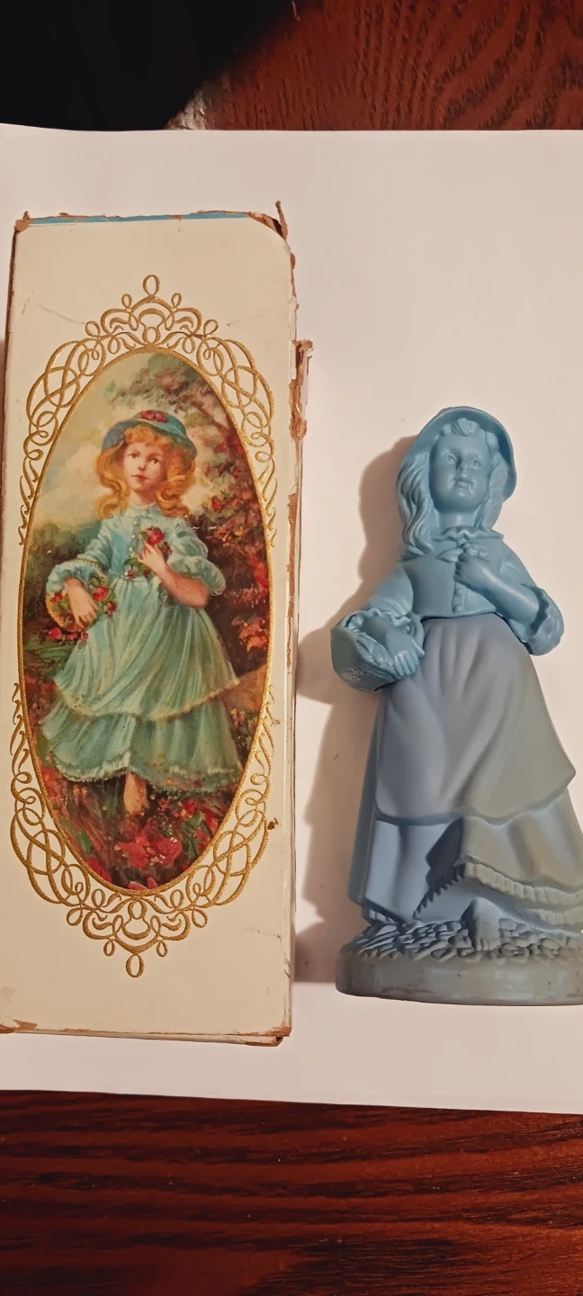 a young girl holding a basket, completed with its original decorative box. The box features a charming oval portrait of a girl in a similar style. It's a lovely decorative cologne. It's a full bottle. 3 oz. ALL MY PRICES ARE NEGOTIABLE !!
