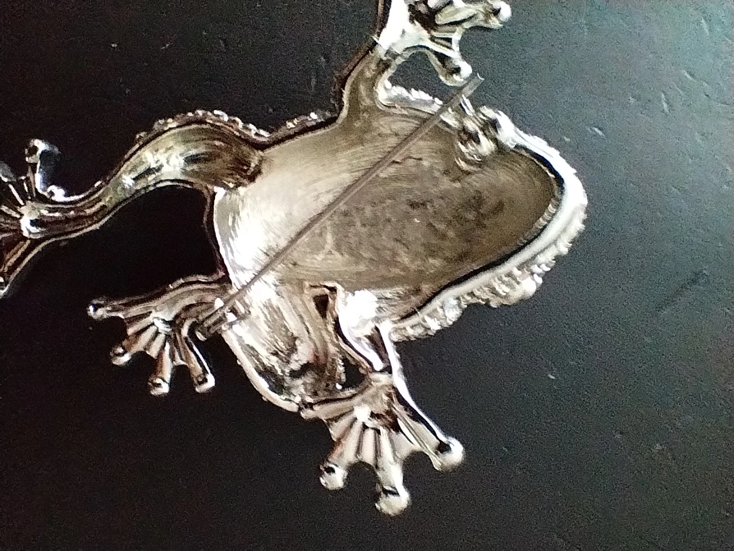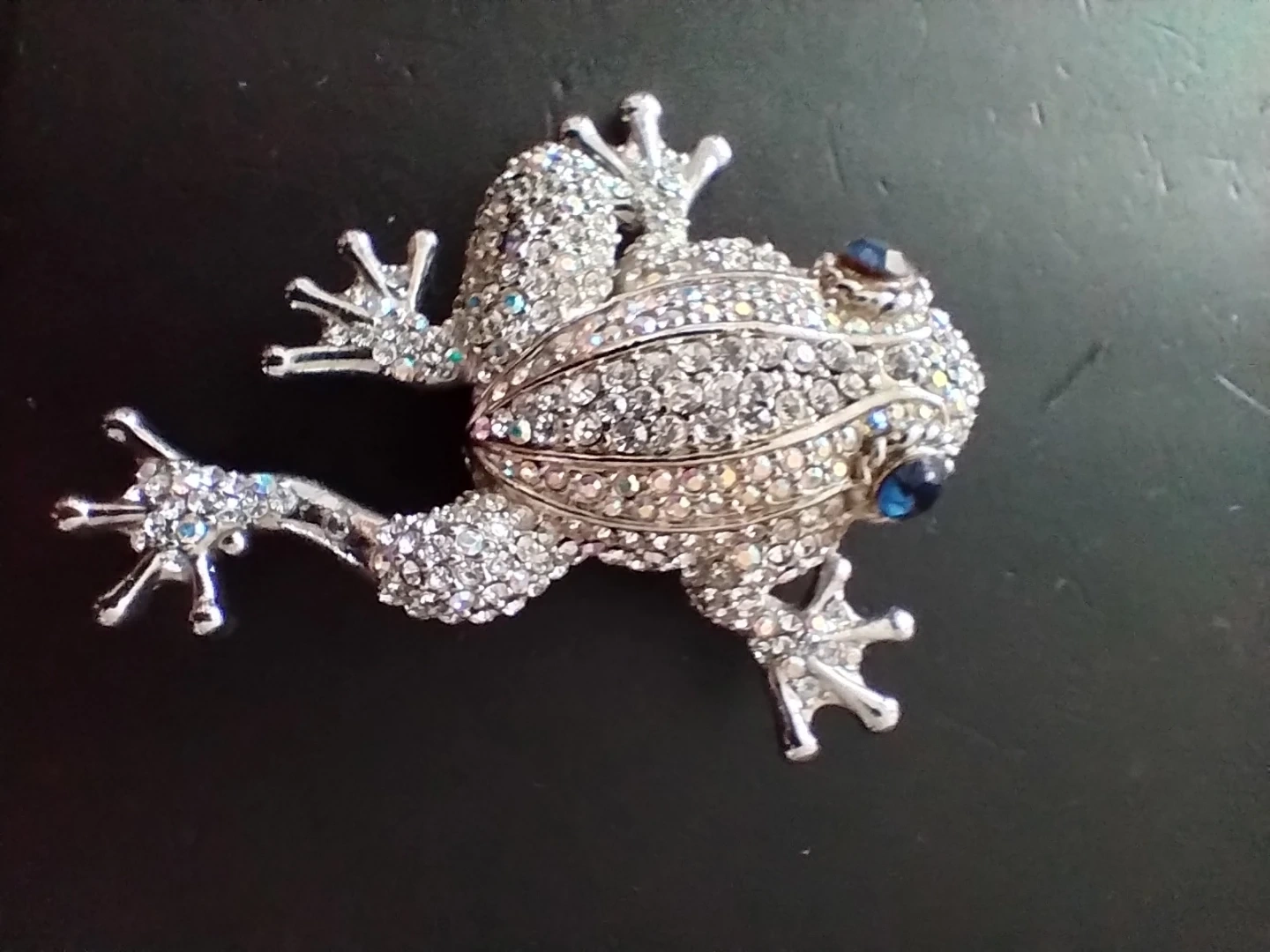 Sparkly frog brooch covered in clear rhinestones with blue gem eyes. It comes in a sheer organza pouch. This piece is embellished with many small clear crystals and two larger blue stones for eyes.