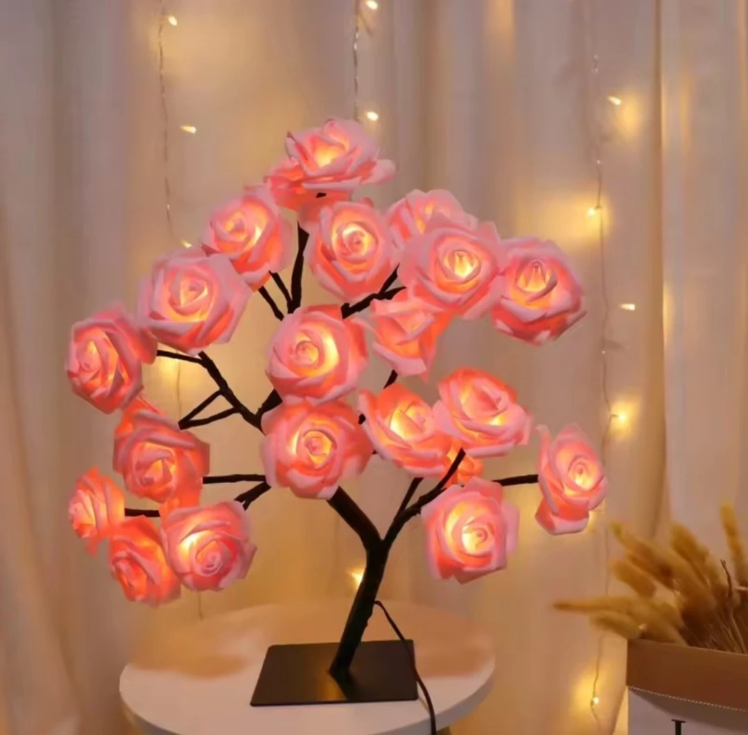 A decorative LED lamp designed to look like a rose tree. It features many pink rose-shaped lights that emit a warm glow. This lamp is powered by a cord and sits on a black square base.